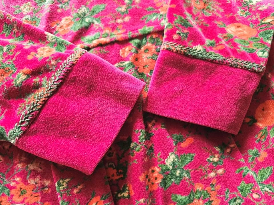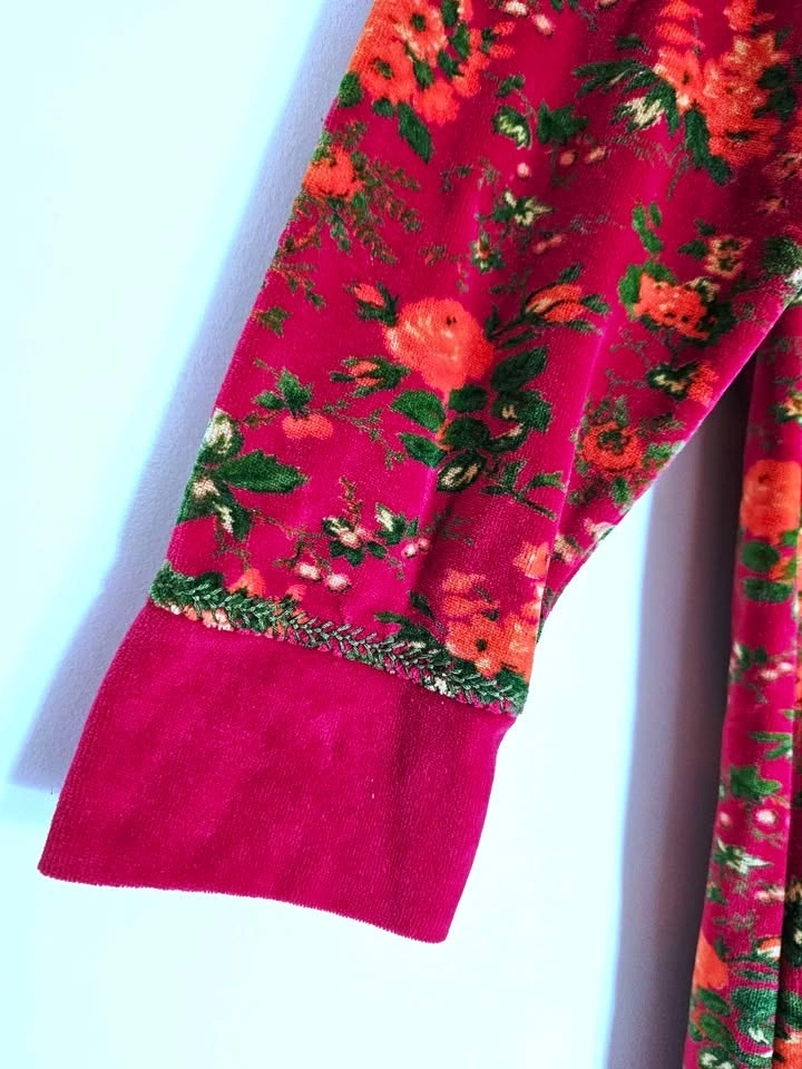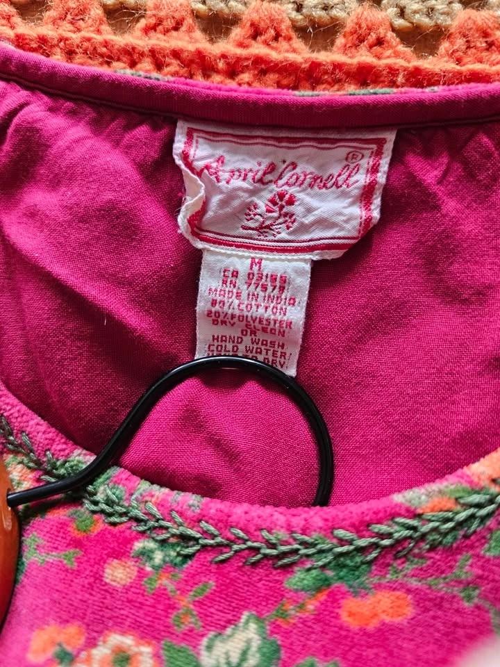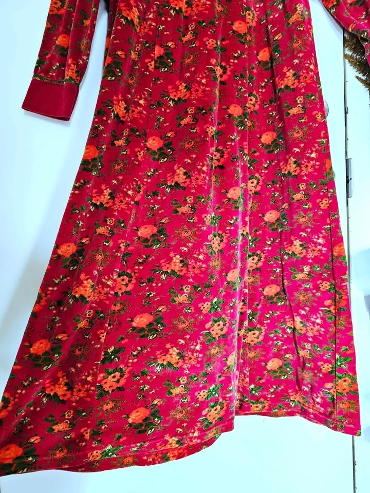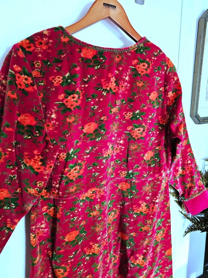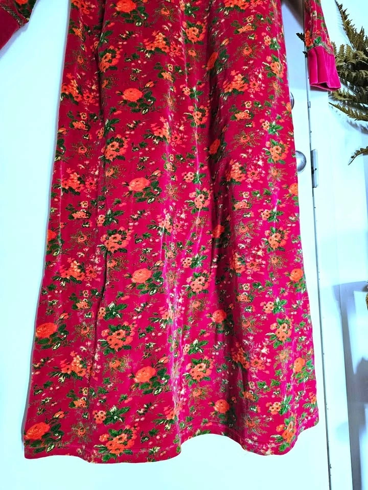 Vibrant, soft and cozy vintage 1990s velvet floral midi/ midaxi dress from April Cornell, in a magenta pink with green and orange floral patterns. Dress has an A-line skirt, long cuffed sleeves, and a round neck. There is decorative green embroidery around the neckline and sleeve cuffs. Dress has a 'maximalist cottagecore meets 90s quirky art teacher' vibe and is perfect for cold weather looks.
