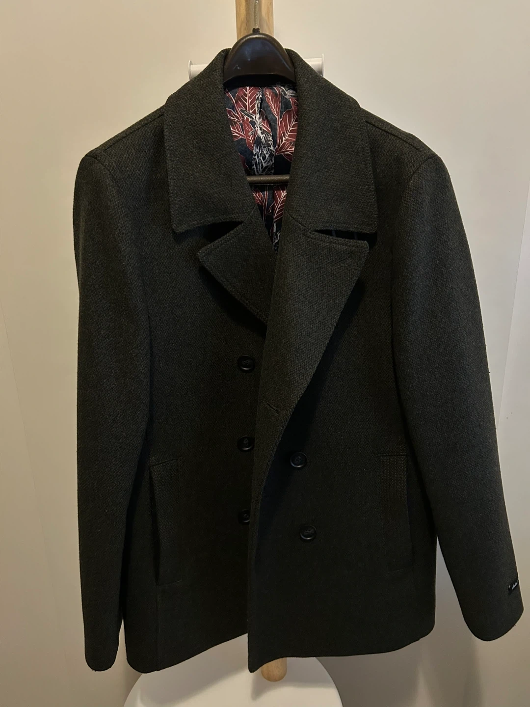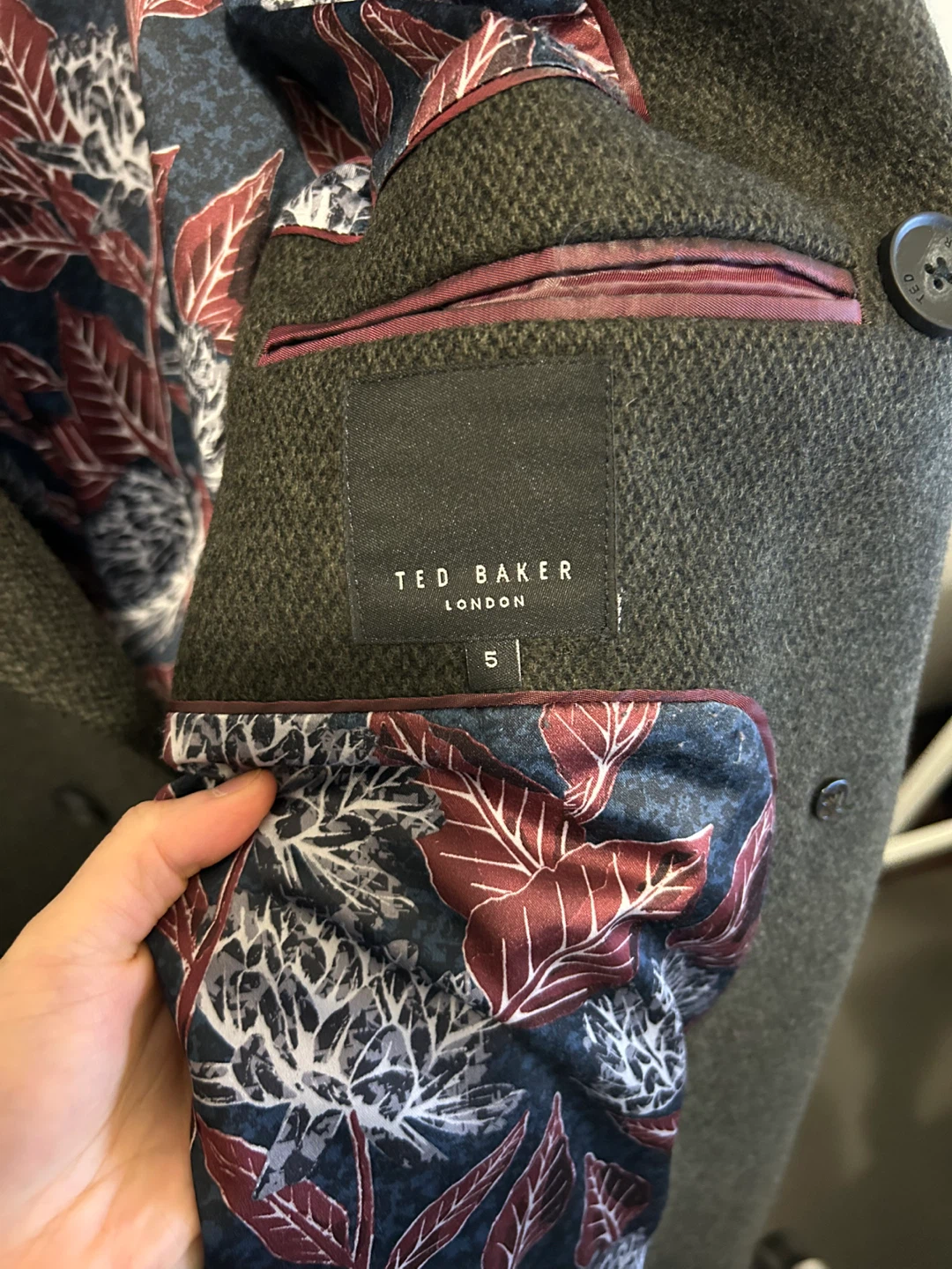 Selling a Ted Baker London coat in a stylish grey colour. It is a size 5. The inside lining has a unique floral pattern, adding a touch of flair to this classic piece