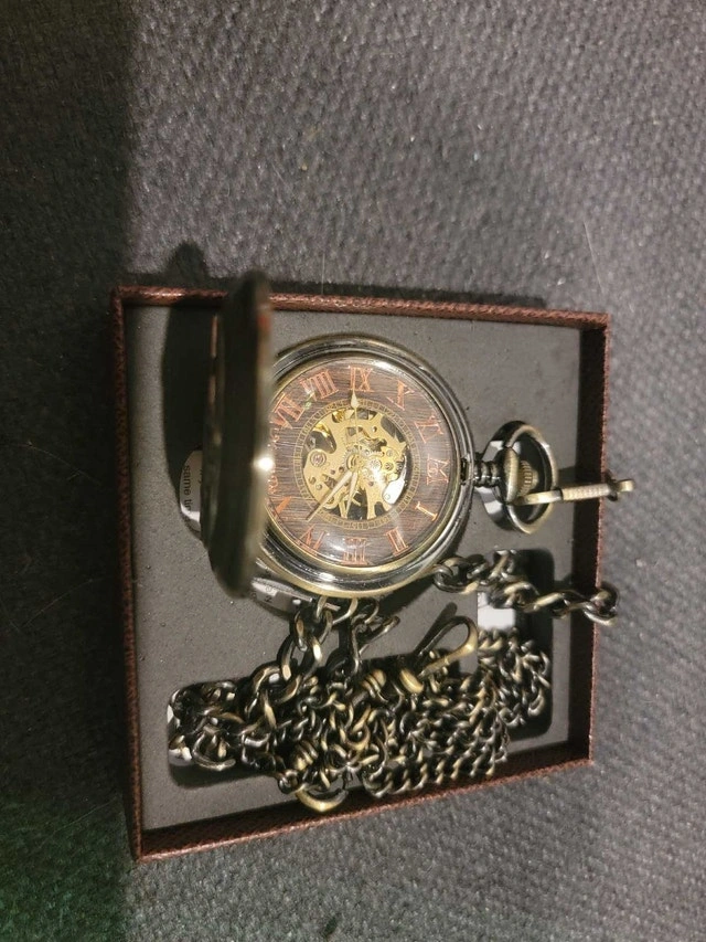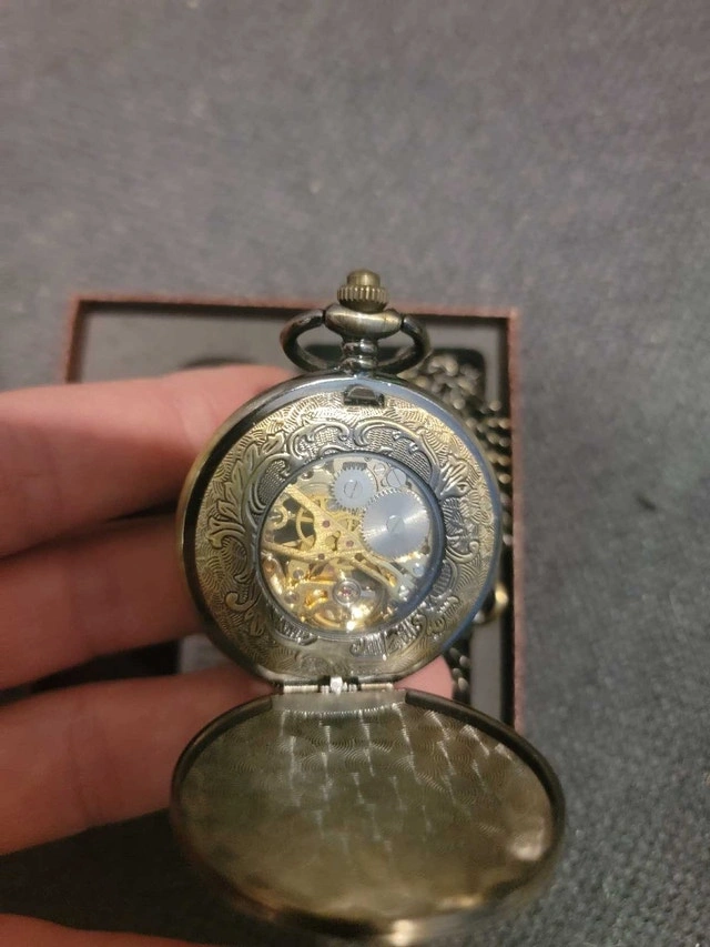This is a mechanical wind-up pocket watch with an antique bronze finish. The watch is in good condition and features an intricate, skeletonized design that allows you to see the inner workings. It comes with a matching chain and is ready to add a touch of vintage charm to your style. * Mechanical Movement * Antique Bronze Finish * Skeleton Design * Includes Chain This pocket watch whispers tales of bygone eras, perfect for adding a dash of whimsy to your daily escapades! And remember, if the ad is still floating around like a message in a bottle, then yes, it's still available!