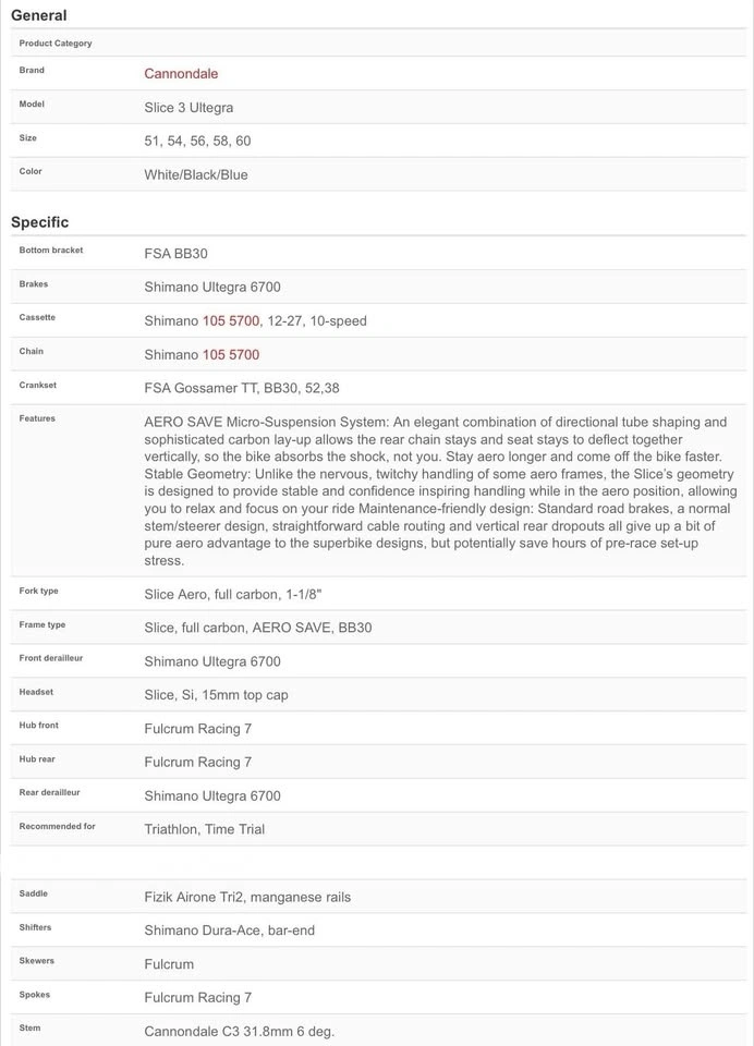 Cannondale Slice Aero Carbon Triathlon Bike - Size 54