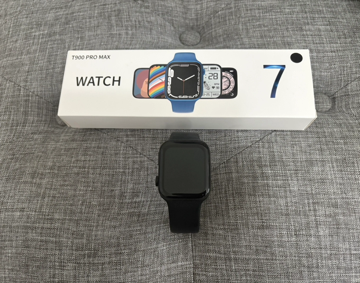 Selling a T900 Pro Max smartwatch in black. It comes with the original box. This watch is perfect for keeping track of your fitness and staying connected on the go!
