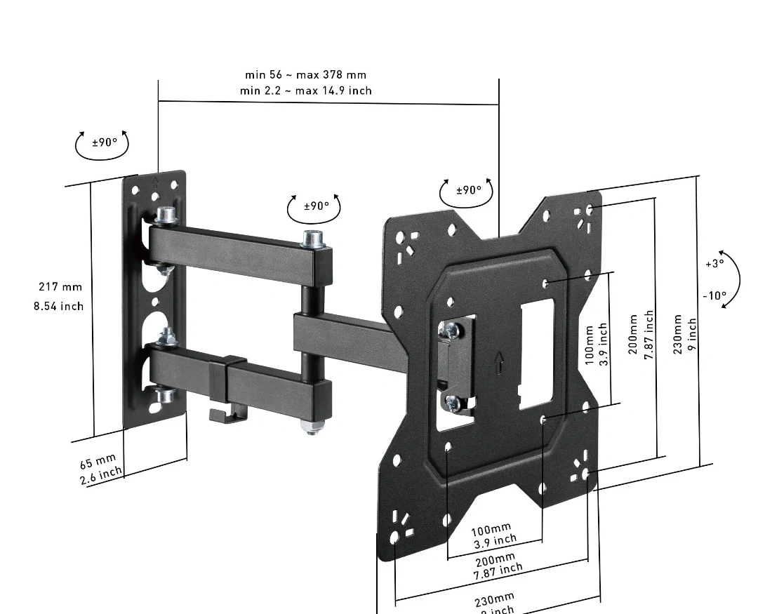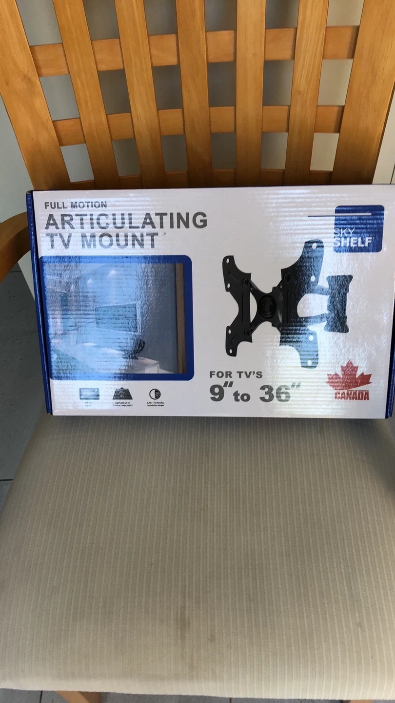 Selling a Sky Shelf full motion articulating TV mount. It's suitable for TVs from 9 to 36 inches. The box is included, along with all the necessary components for installation. It is designed for full motion and articulation, giving you flexibility in positioning your TV