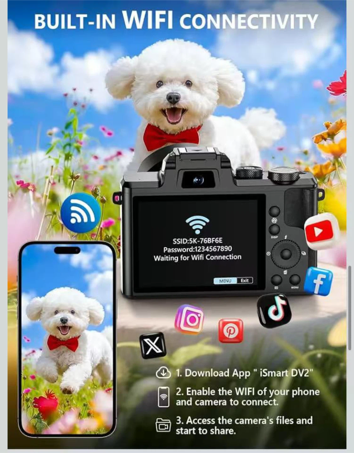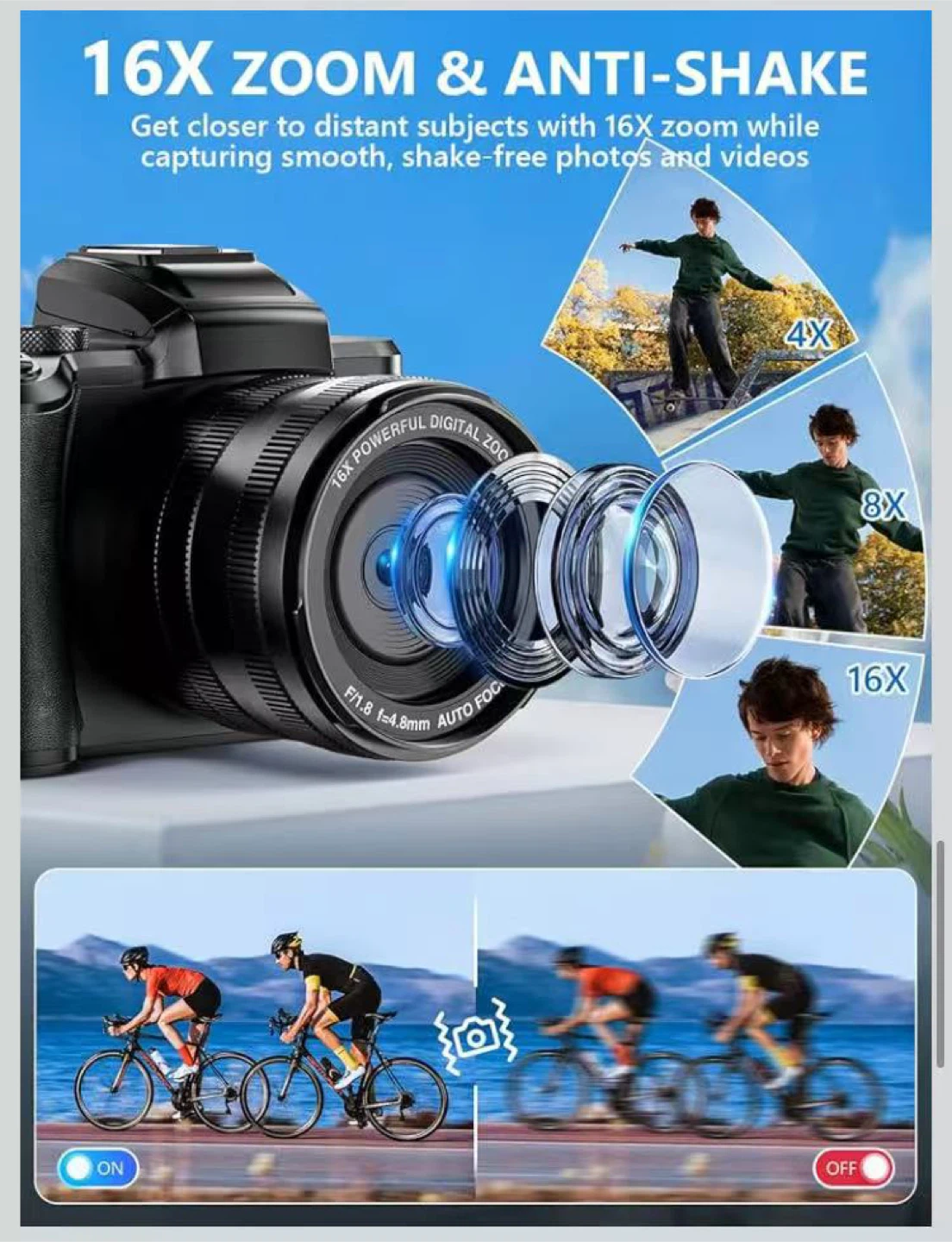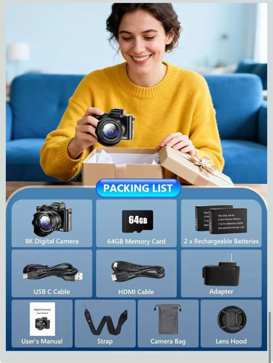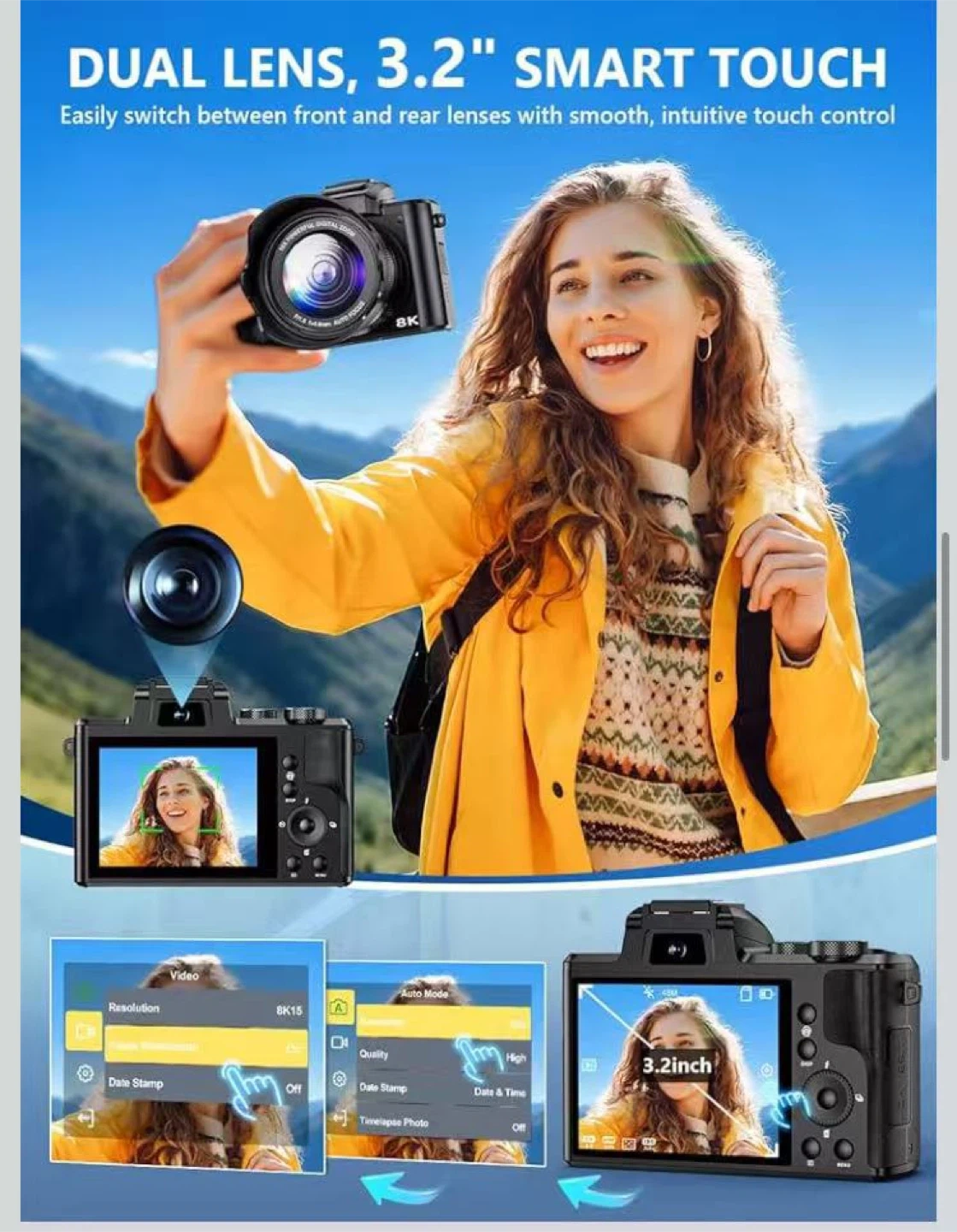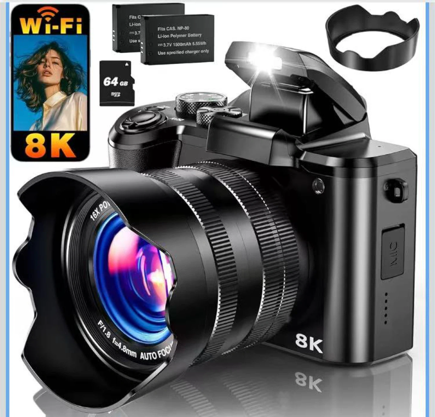 8K Digital Camera, 88MP WiFi Cameras for Photography with 3.2" Touchscreen, 16X Zoom Autofocus Vlogging Camera for YouTube Video, Anti-Shake, Dual Camera, 2 Batteries, 64GB Card, Flash, Lens Hood