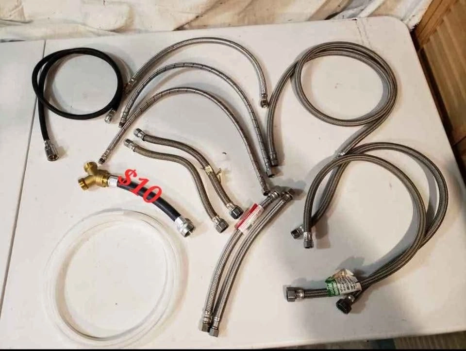 Collection of faucet supply lines / braided faucet hoses. Connections used to link a faucet to the water supply valves.