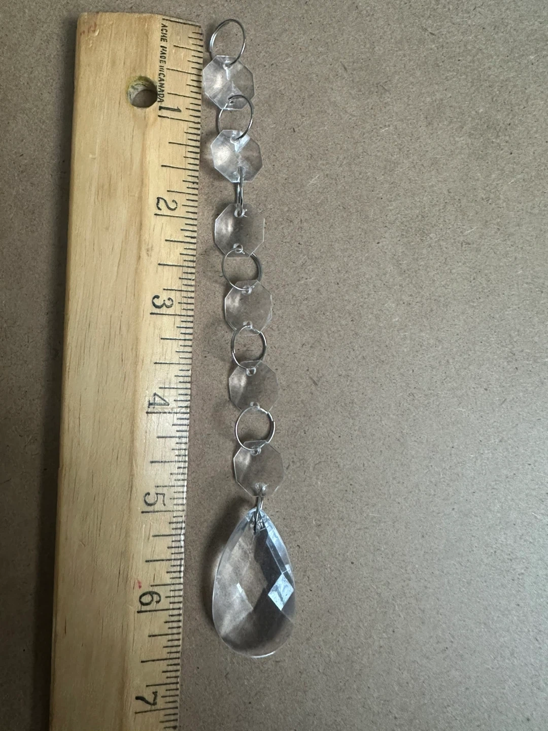 Selling a chandelier crystal garland strand. It's a clear, decorative piece that can add a touch of elegance to any space. The strand features teardrop-shaped crystals linked together with small metal rings. Perfect for chandeliers or other decorative projects! Never been used - extras from wedding decor. Cash Only