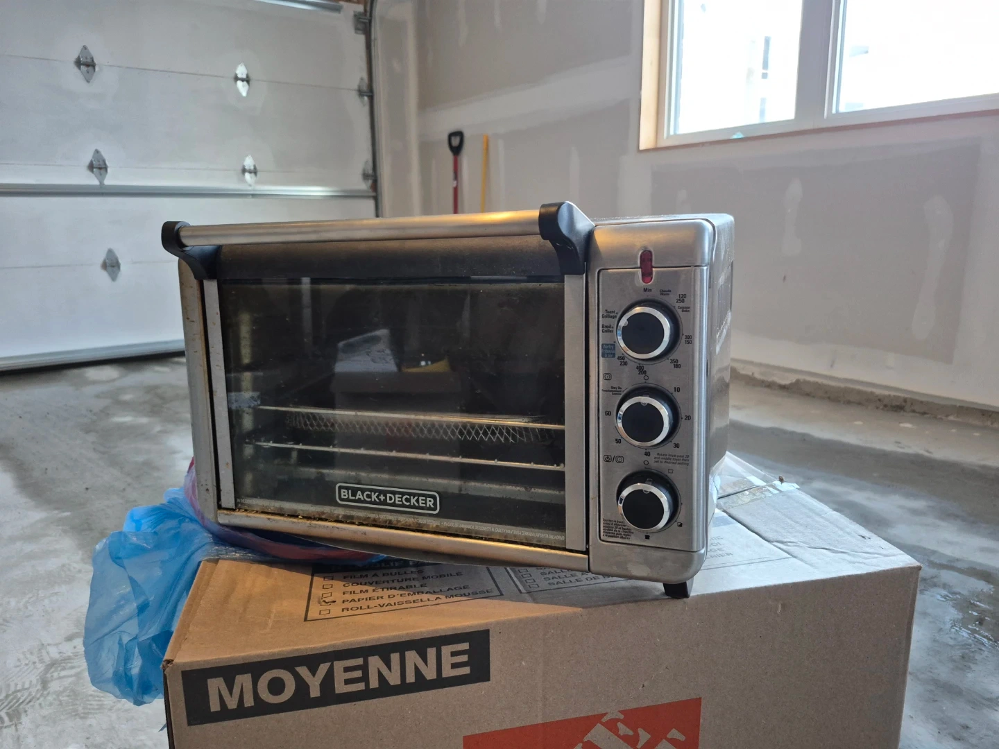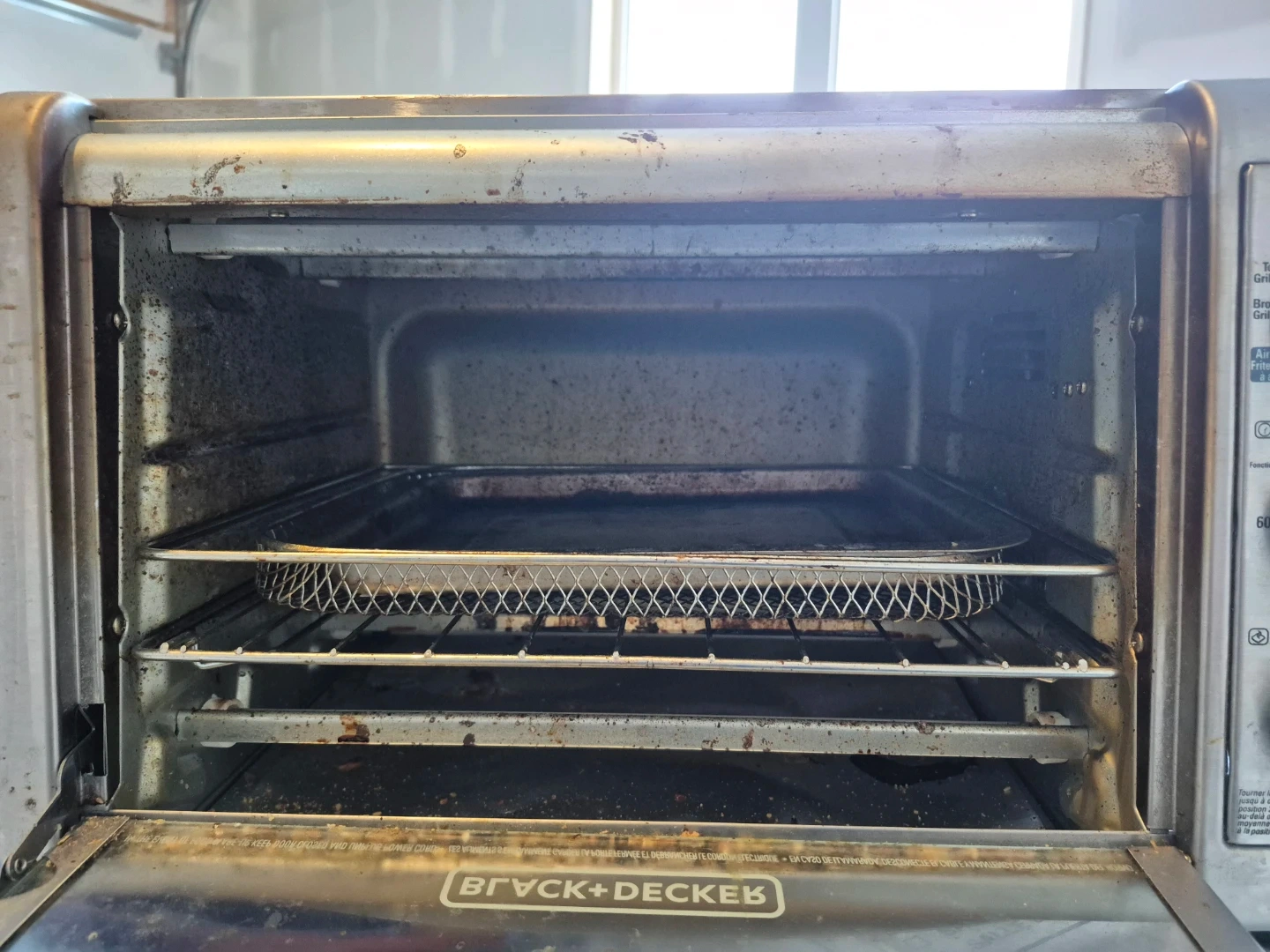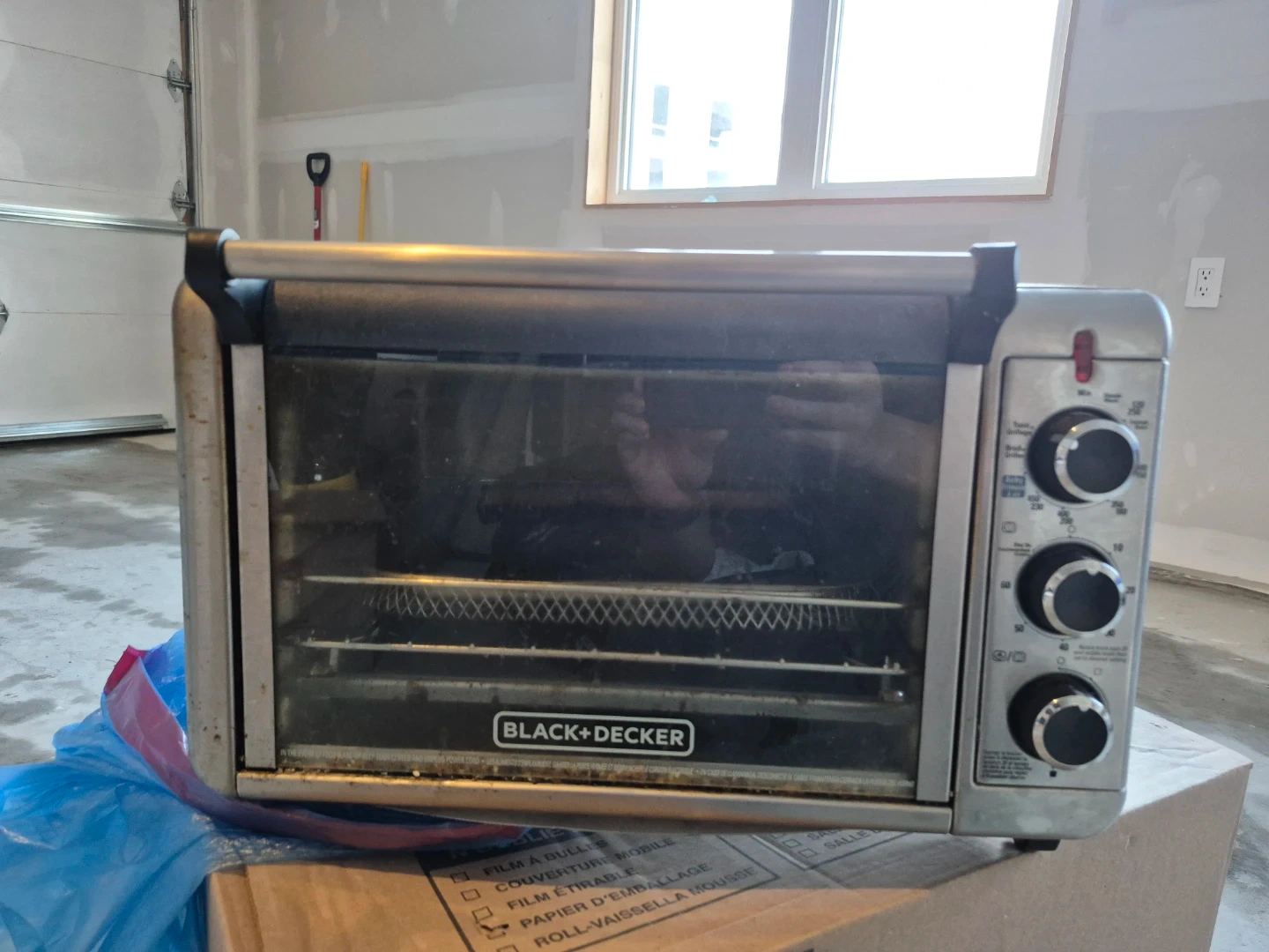 Selling a Black+Decker toaster oven. It's in used condition, showing some signs of wear. Perfect for small kitchens or quick meals!