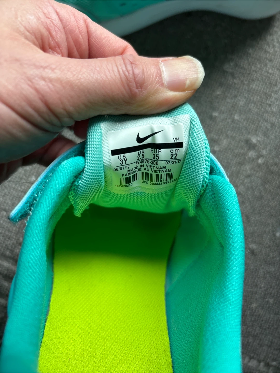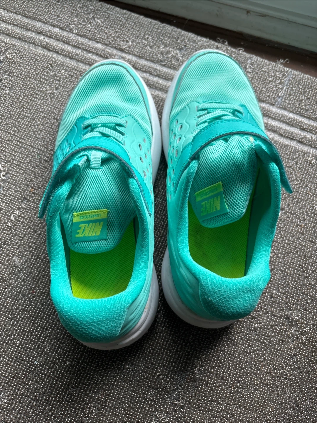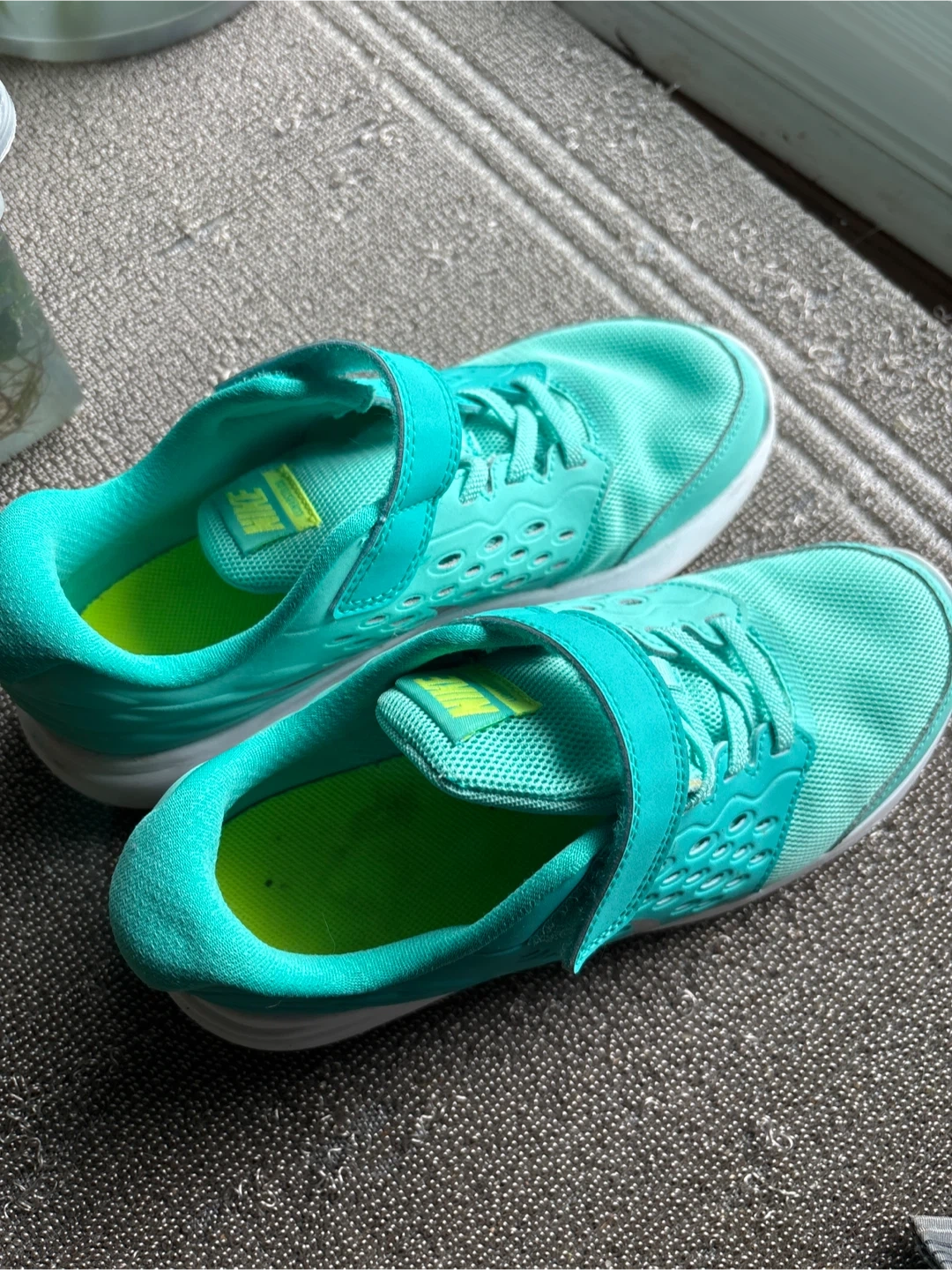 Selling a pair of Nike Flex Contact running shoes for kids in a vibrant turquoise colour! These are a size 3Y. They feature a convenient velcro strap, making them easy for kids to put on and take off. Perfect for running and playing!