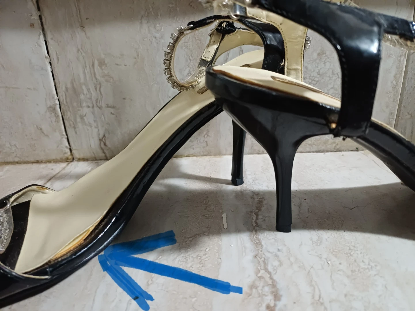 They are unworn but a bit of the sole liner is lifting and can use a touch of glue, as you can see in the photo with blue arrow. A stylish pair of shoes.
