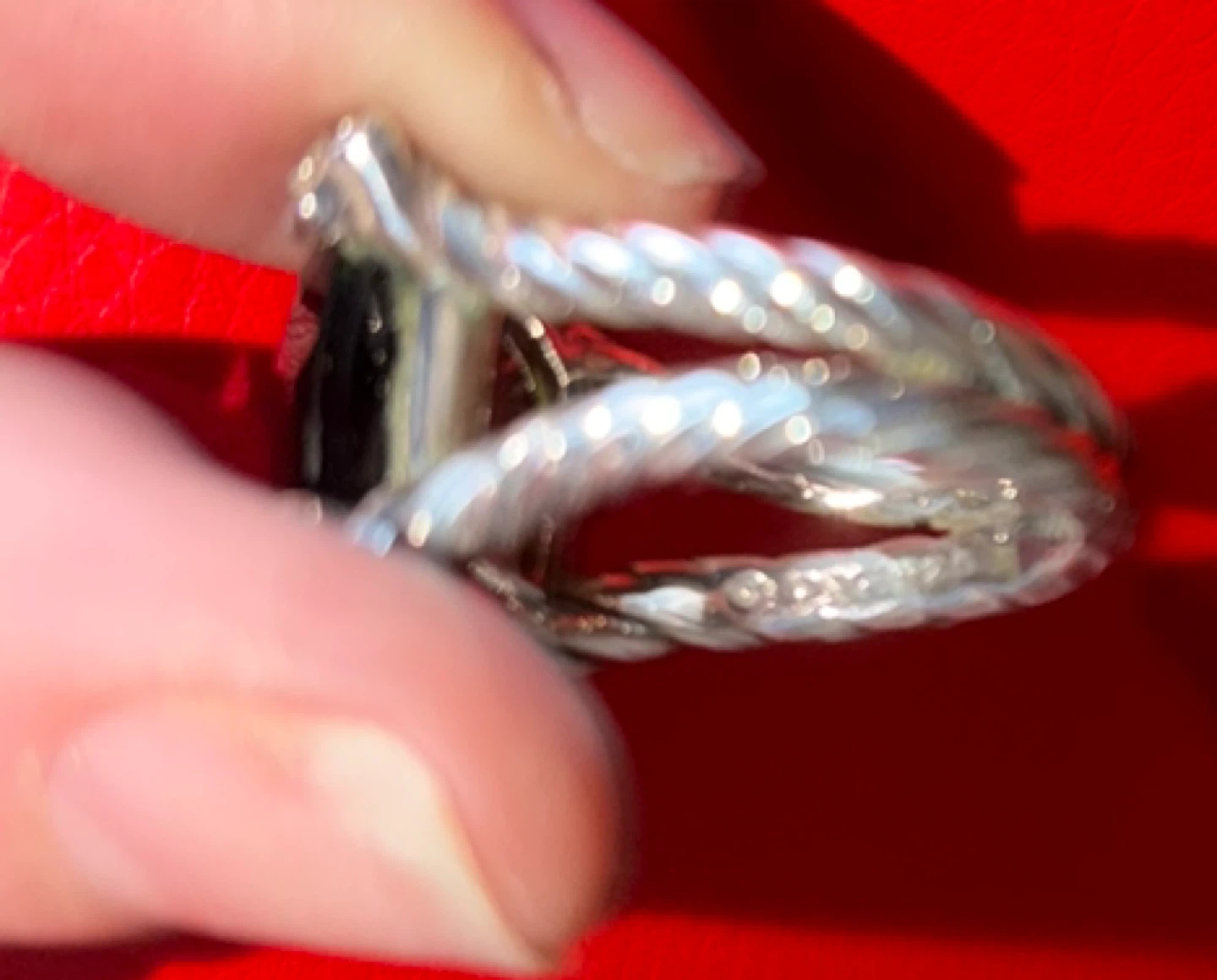 Selling a David Yurman ring featuring a beautiful green stone! It comes with its original pouch. The ring is in great condition and ready to add a touch of elegance to your jewelry collection. DAVID YURMAN Cushion On Point 16mm Prasiolite Diamond Ring Size 5.25 Metal: Sterling Silver Gemstone: Prasiolite
