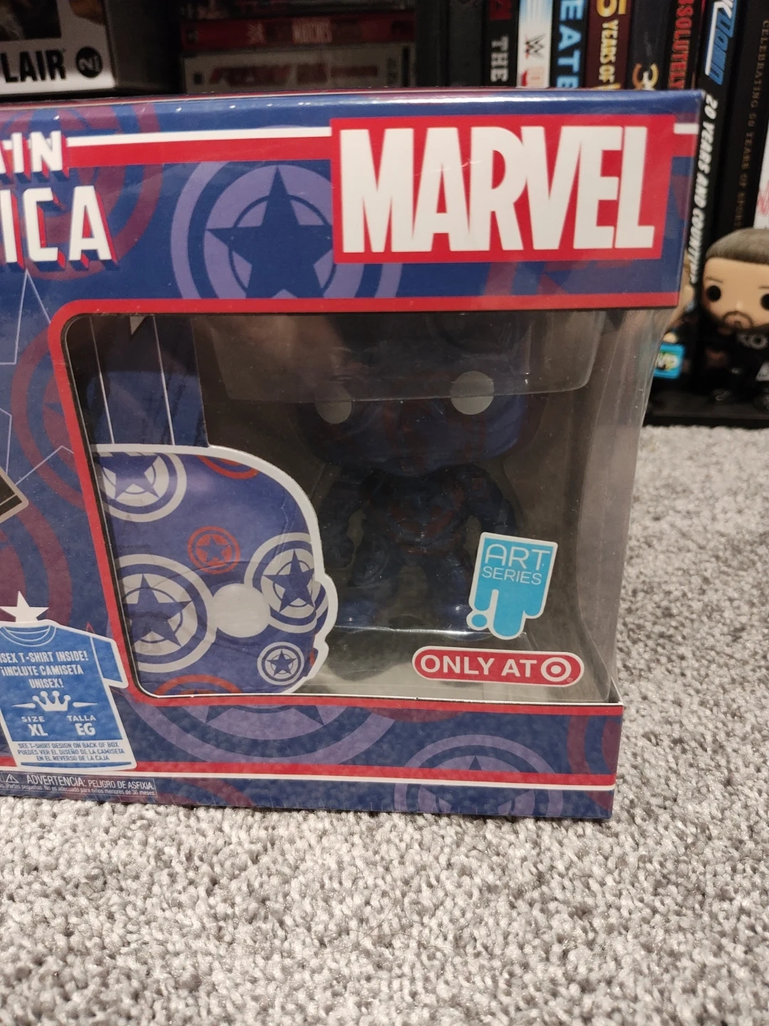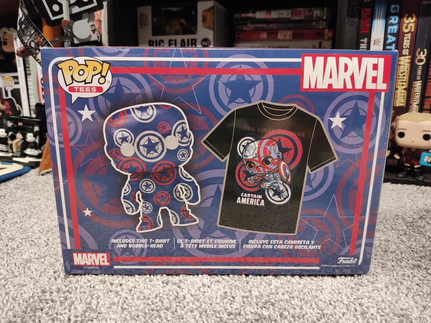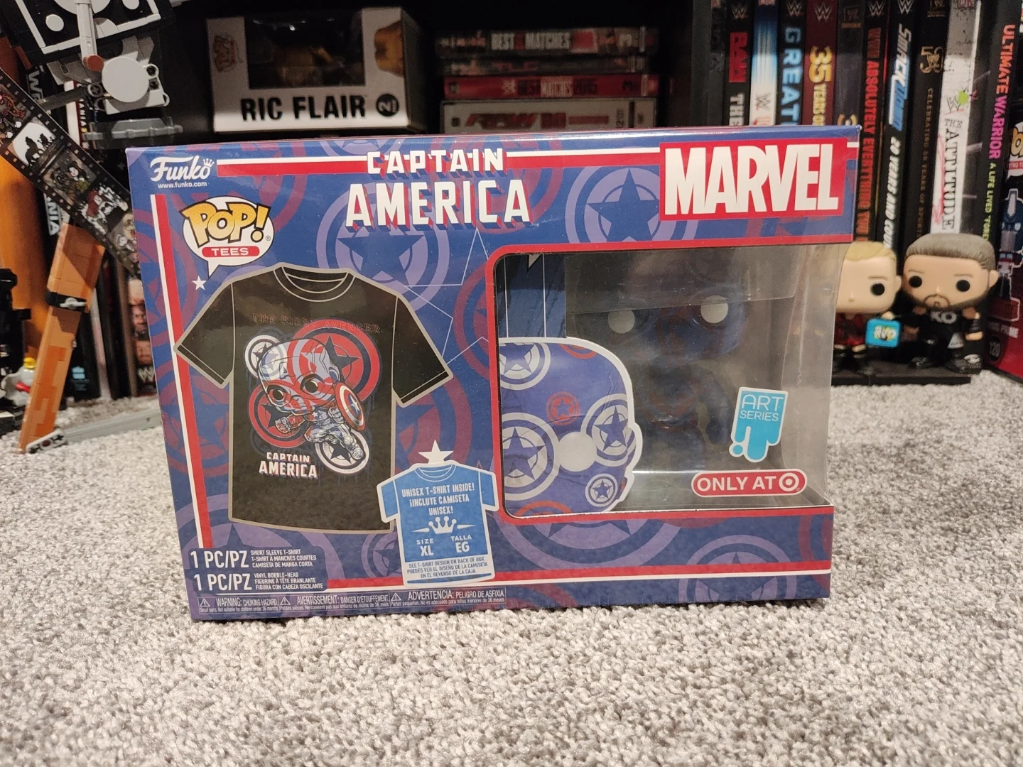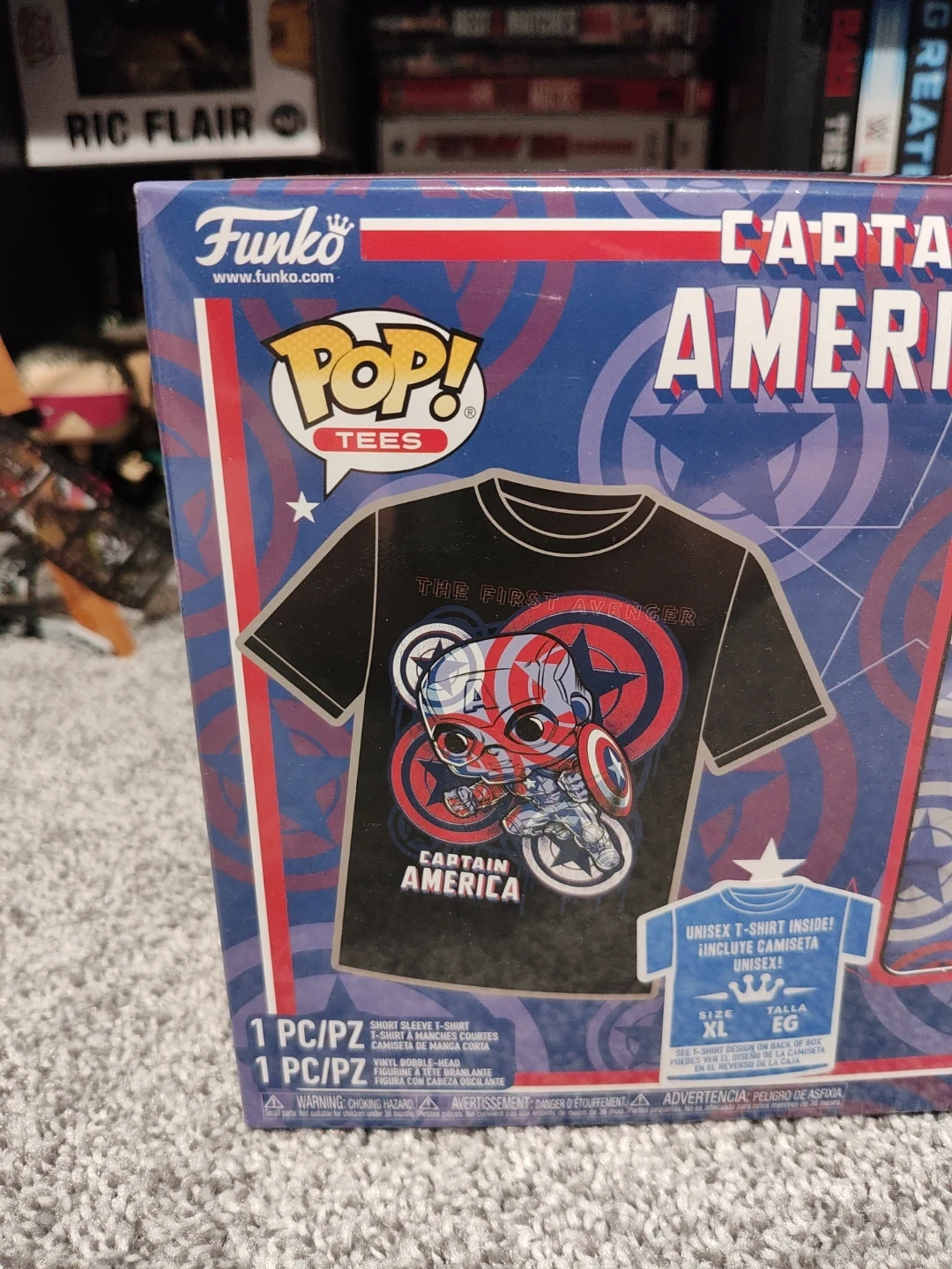 Funko Pop! Tees Marvel Captain America with T-shirt and Art Style Bobble-Head. The shirt is size XL. This was a Target Exclusive set. Also, the Poison Captain America Pop is also included. This Pop was a Pop in the Box exclusive. Both are brand new, sealed and in excellent condition!