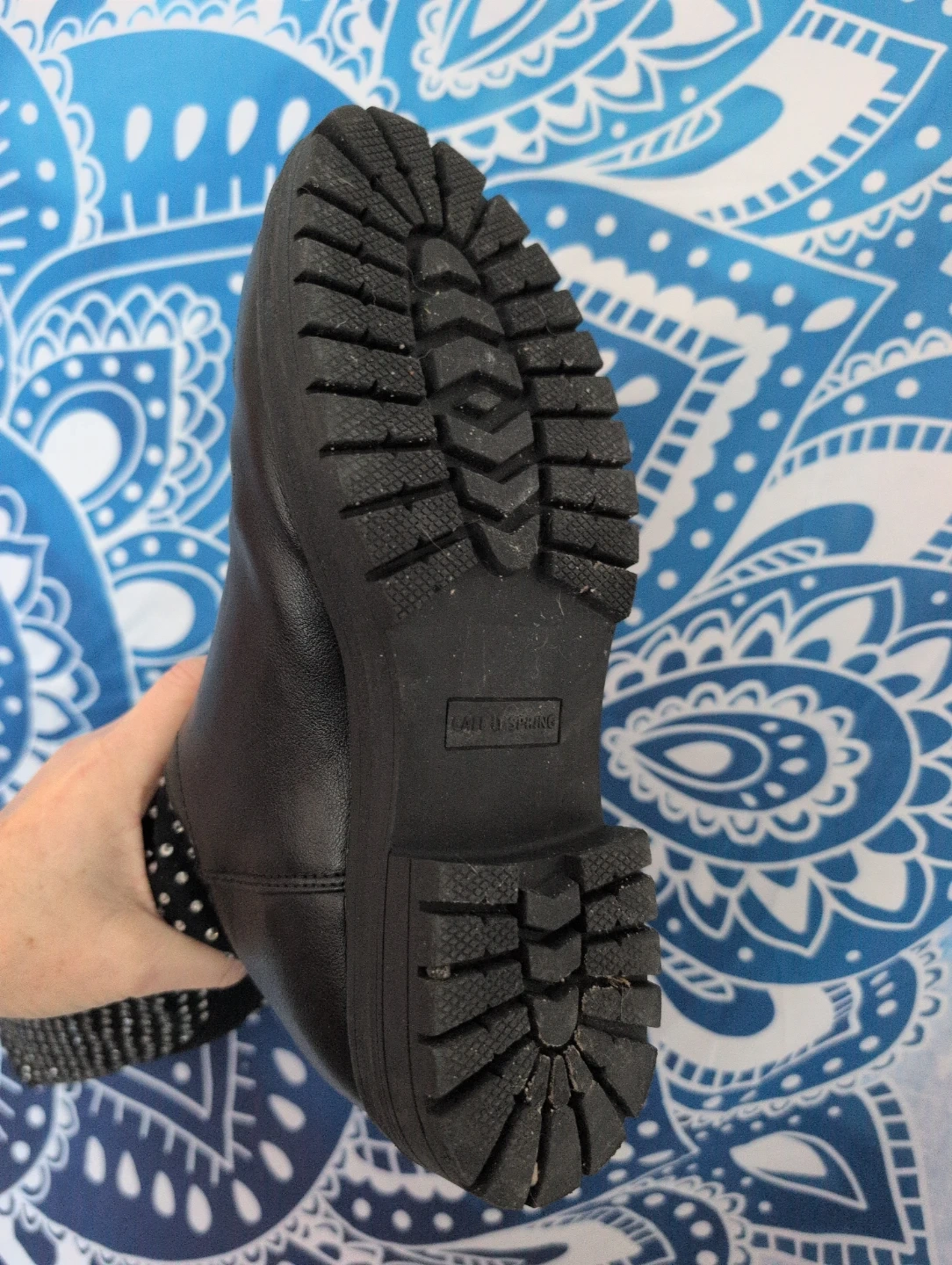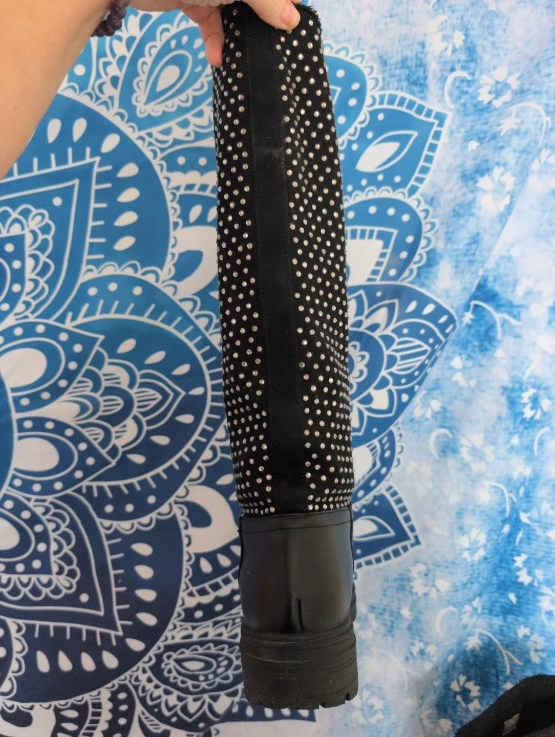 Gemstone covered knee high black boots from Call It Spring are a stylish addition to any wardrobe! They feature a studded design on the upper part of the boot a couple missing as seen in the photos. Waterproof and warm for those cold winter days. I rarely wore them as I have a high arch which makes getting them on difficult.
