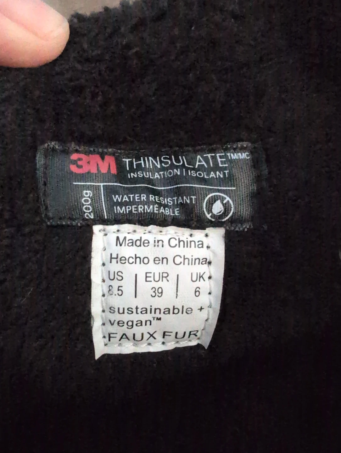 The size is US 8.5, EUR 39, UK 6. The boots also have 3M Thinsulate insulation and are made with faux fur