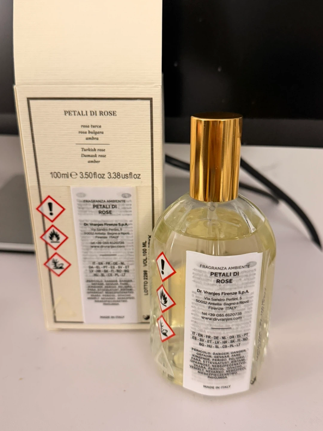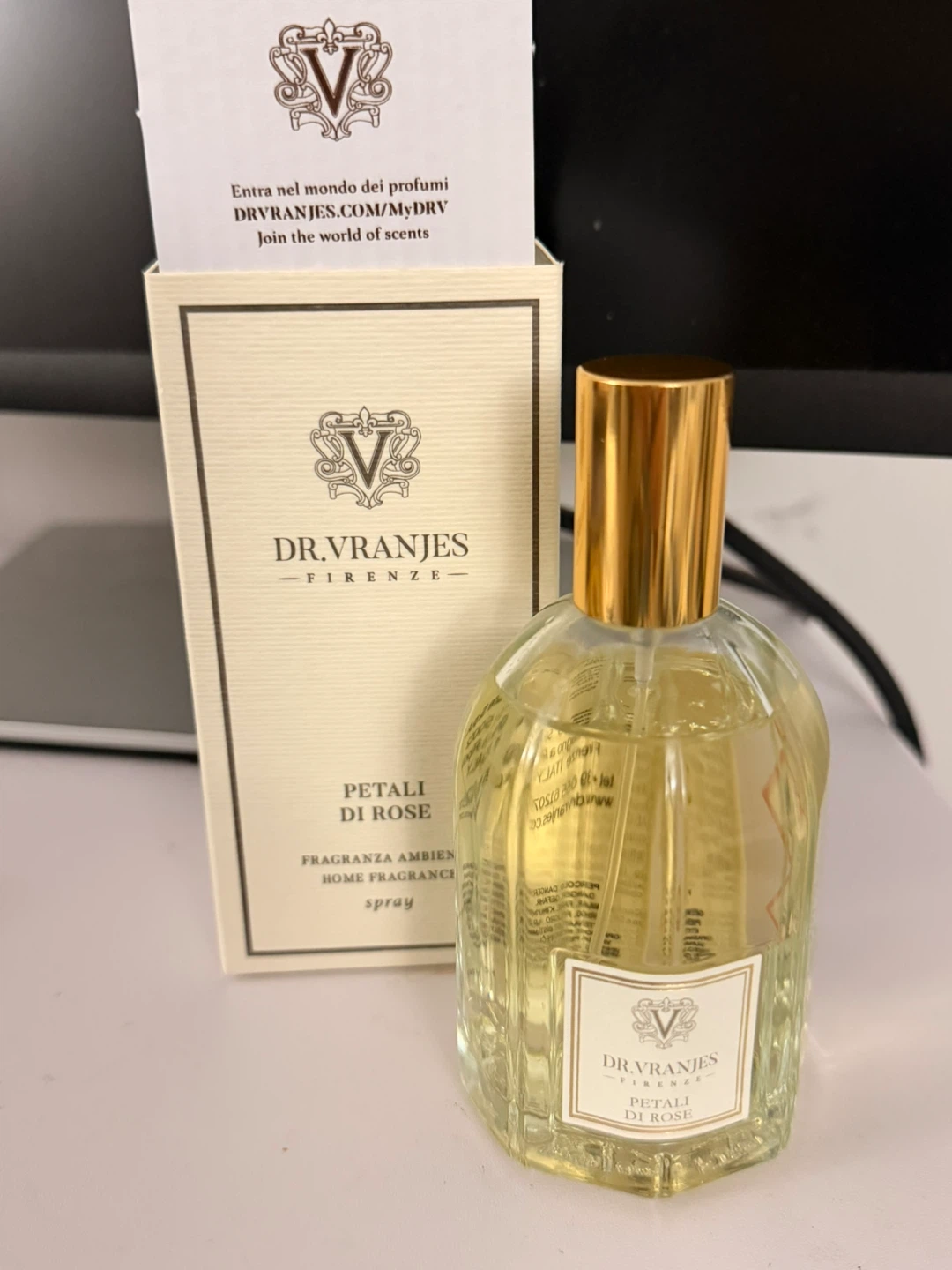 Selling a bottle of Dr. Vranjes Firenze Petali Di Rose home fragrance spray from Italy. It's a lovely fragrance for your home! The bottle contains 100ml / 3.38 us fl oz. The box is included. Took the fragrance spray bottle out for pictures, front and back.