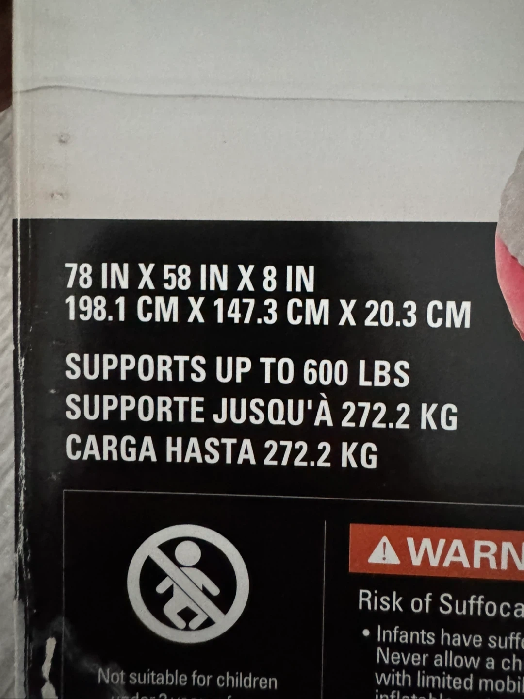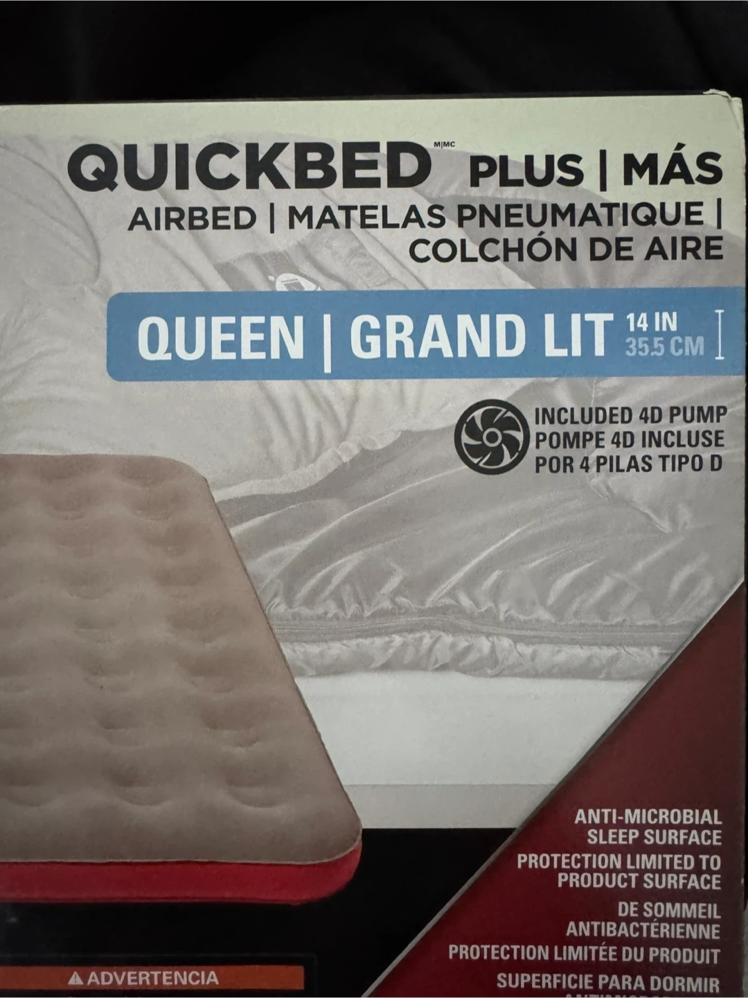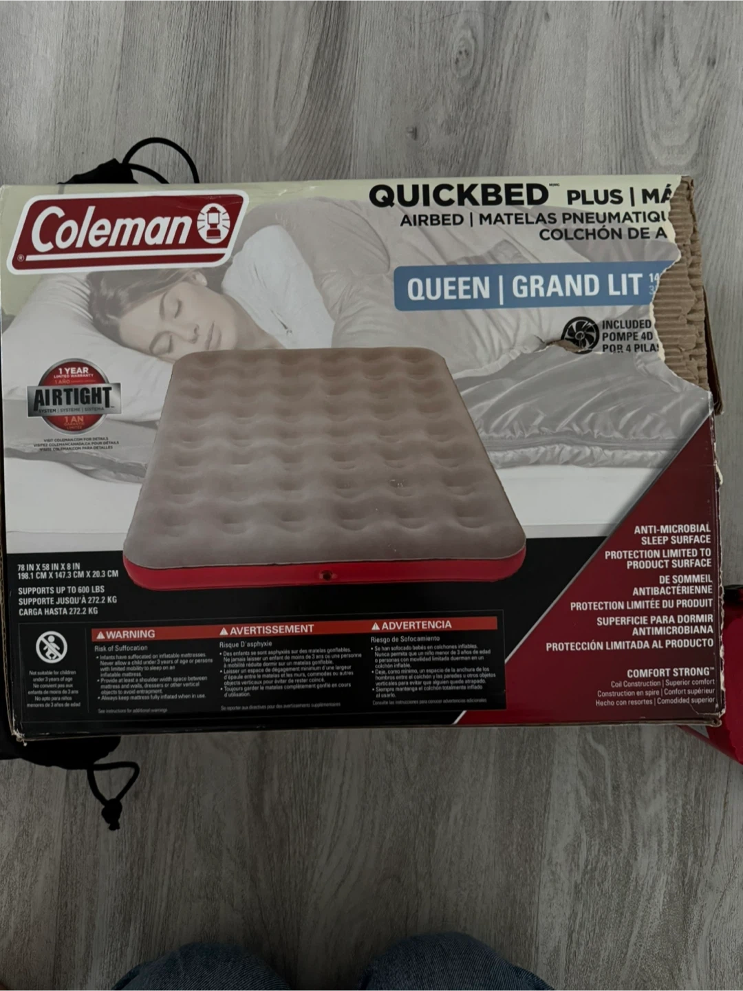 Selling a Coleman Quickbed Plus air mattress in Queen size. It supports up to 600 lbs. Dimensions are 78 in x 58 in x 8 in (198.1 cm x 147.3 cm x 20.3 cm). It also comes with a 4D QuickPump and a carry bag