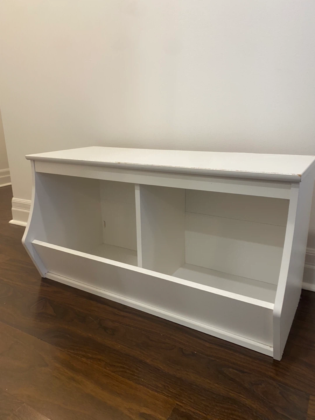 Selling a white toy storage shelf. It has two compartments and a lower shelf. Great for organizing toys or books in a kid's room or playroom