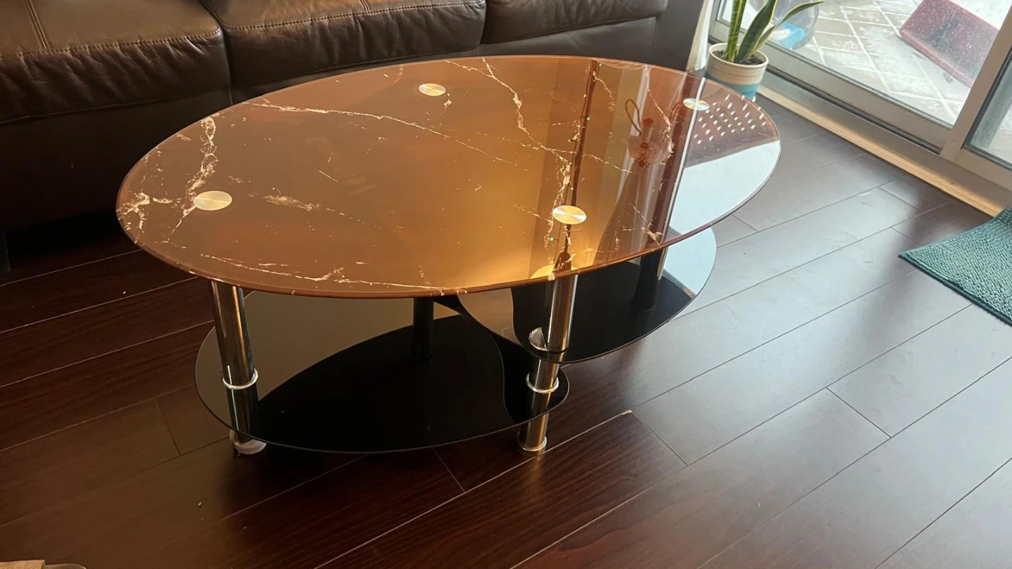 Selling an oval glass coffee table! It has a faux marble design on the top glass and a black glass shelf underneath. The legs are a shiny chrome colour. It's in great condition and would look great in any living room
