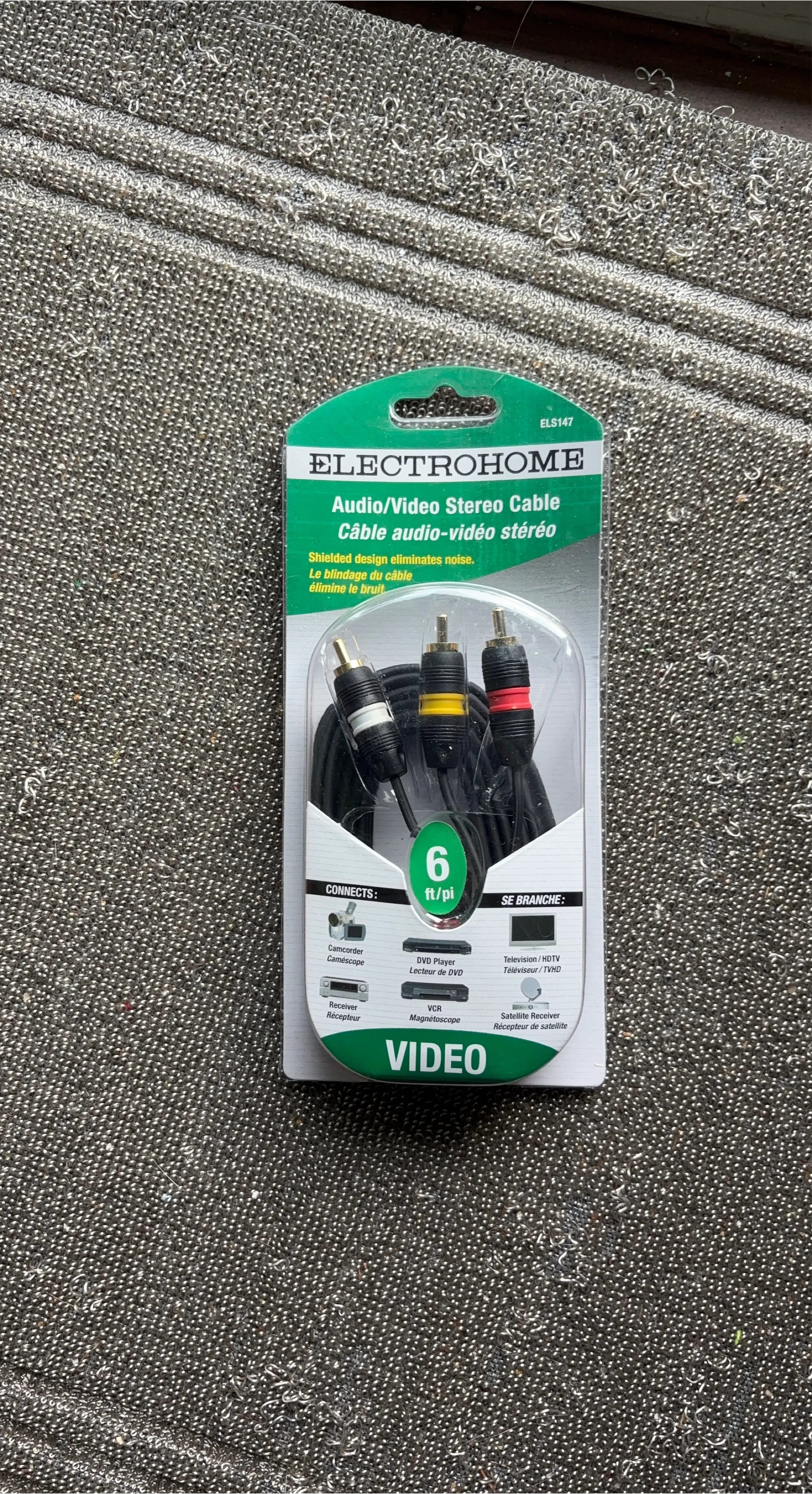 Selling a brand new Electrohome audio/video stereo cable. It's 6 ft long and has a shielded design to eliminate noise. Connects to your camcorder, DVD player, VCR, receiver, television, and satellite receiver