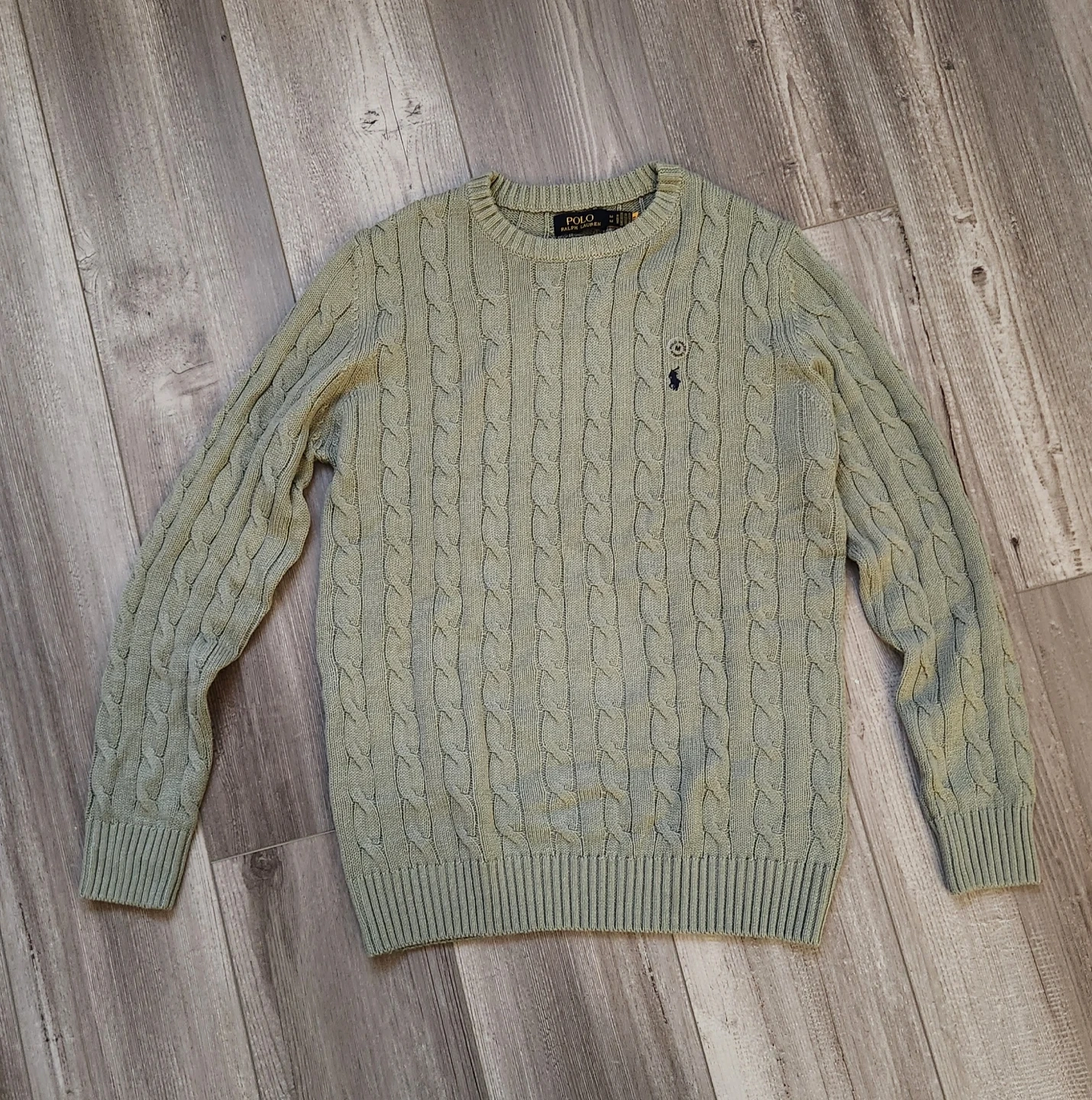 Here's a Polo Ralph Lauren cable-knit cotton sweater in a light green color. It's a size medium and in great condition! The material is soft and comfortable, perfect for layering or wearing on its own. (Payment: Cash Only)