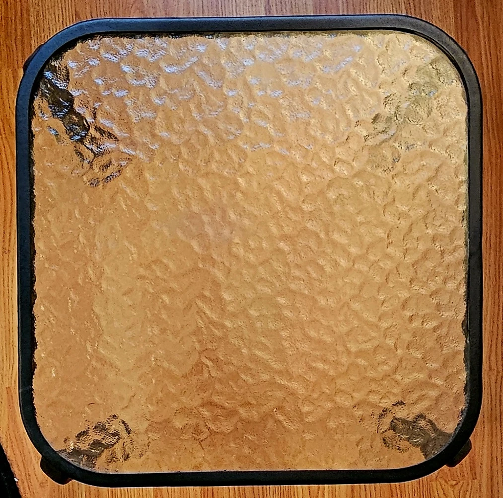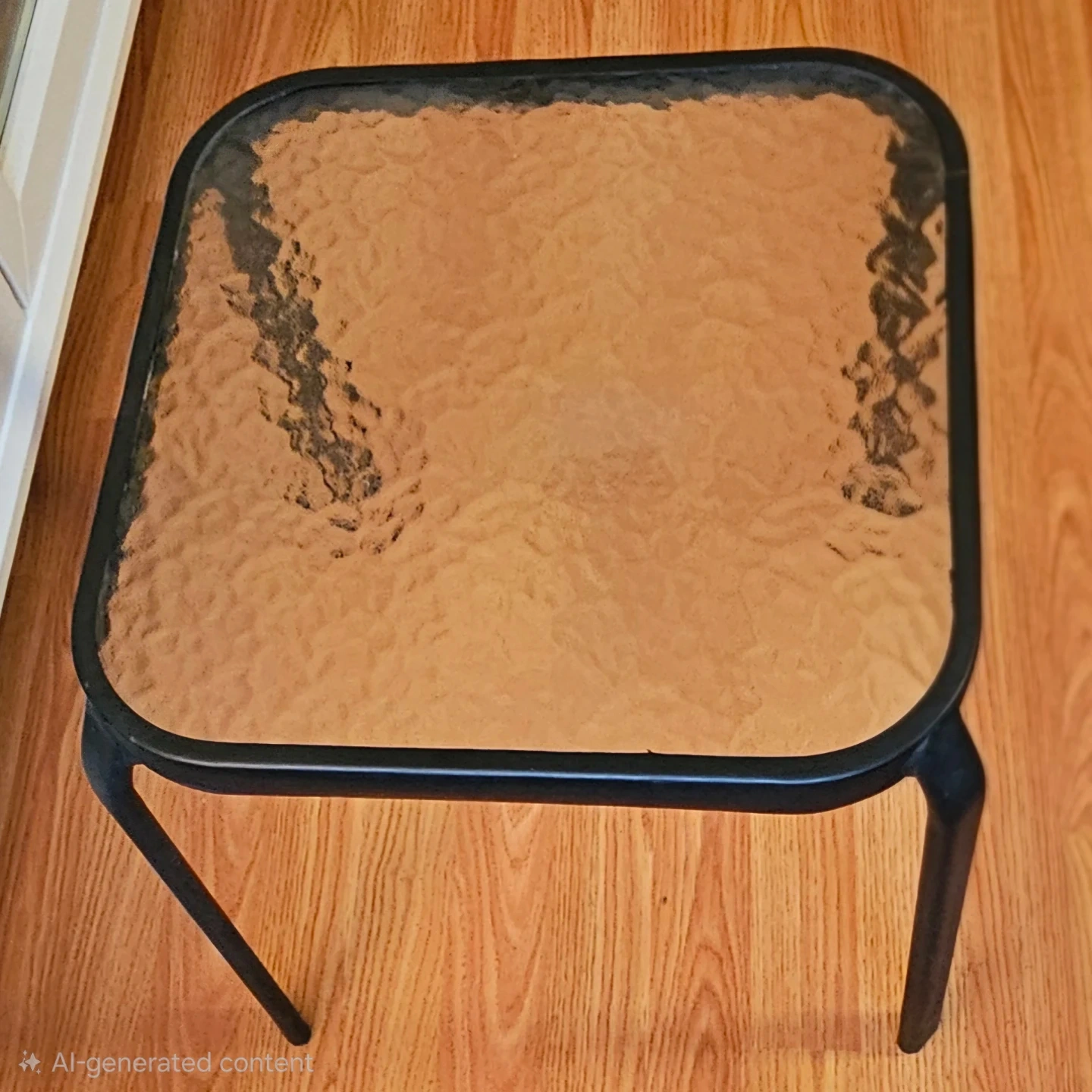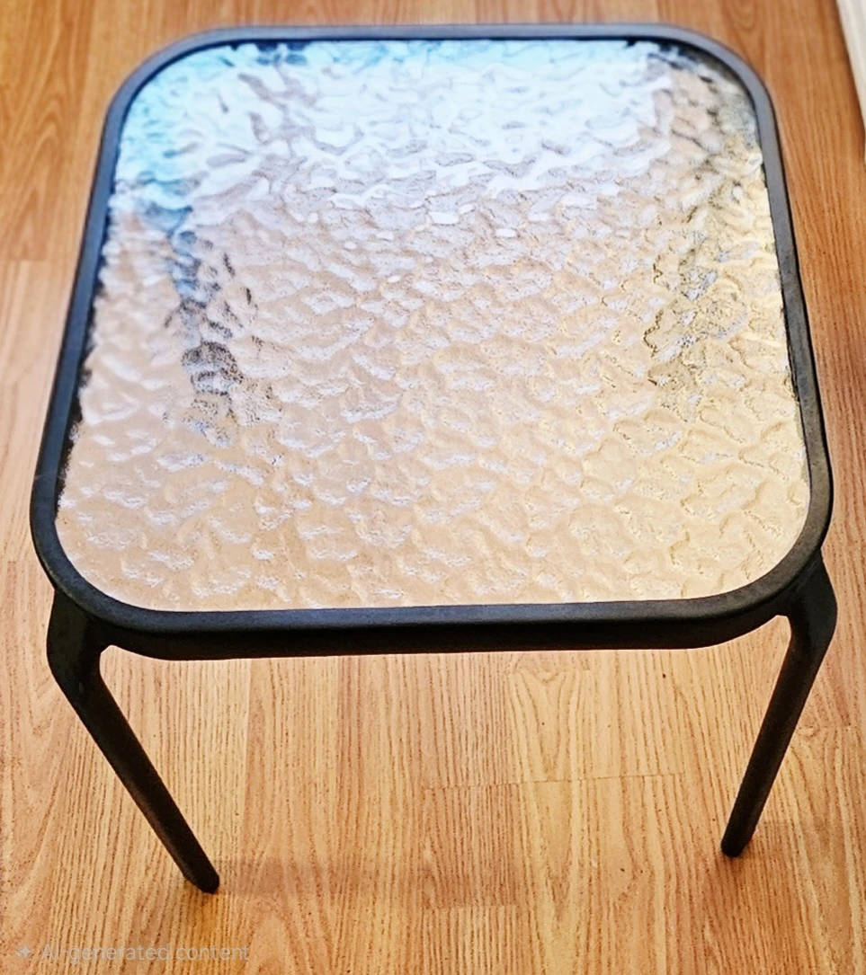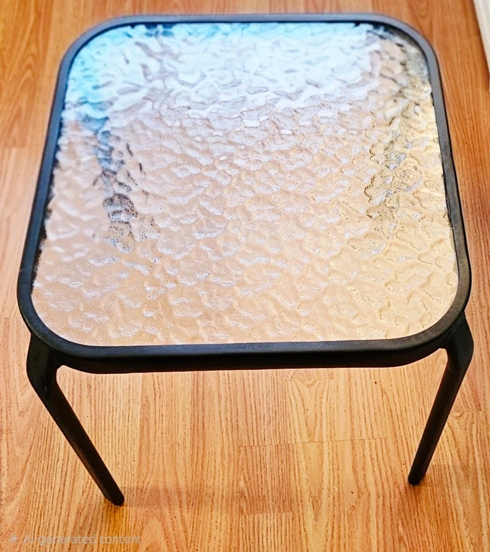 Selling a side table with a glass top. It has a black metal frame and is in great condition. Perfect for a small space or as an accent piece!