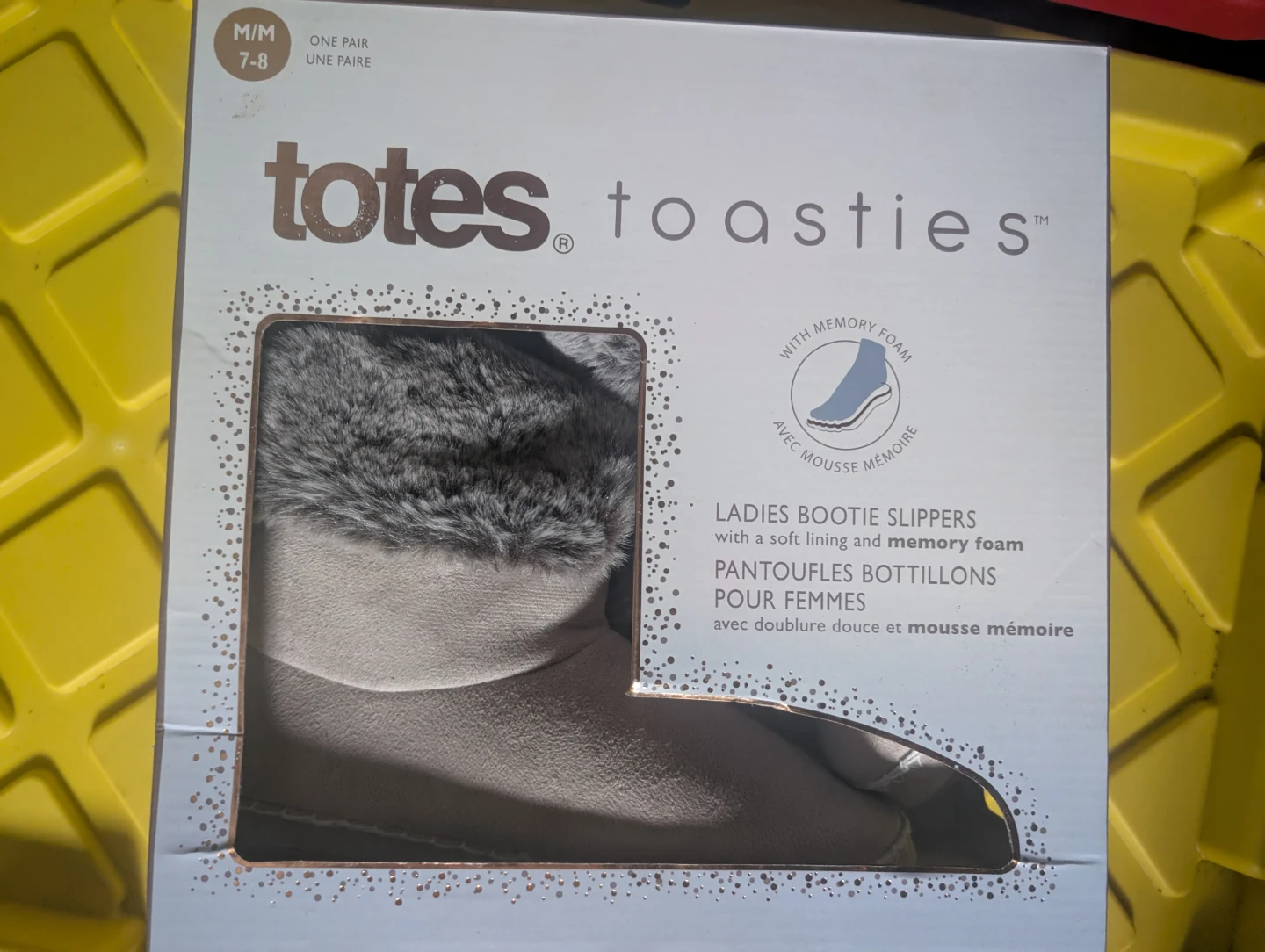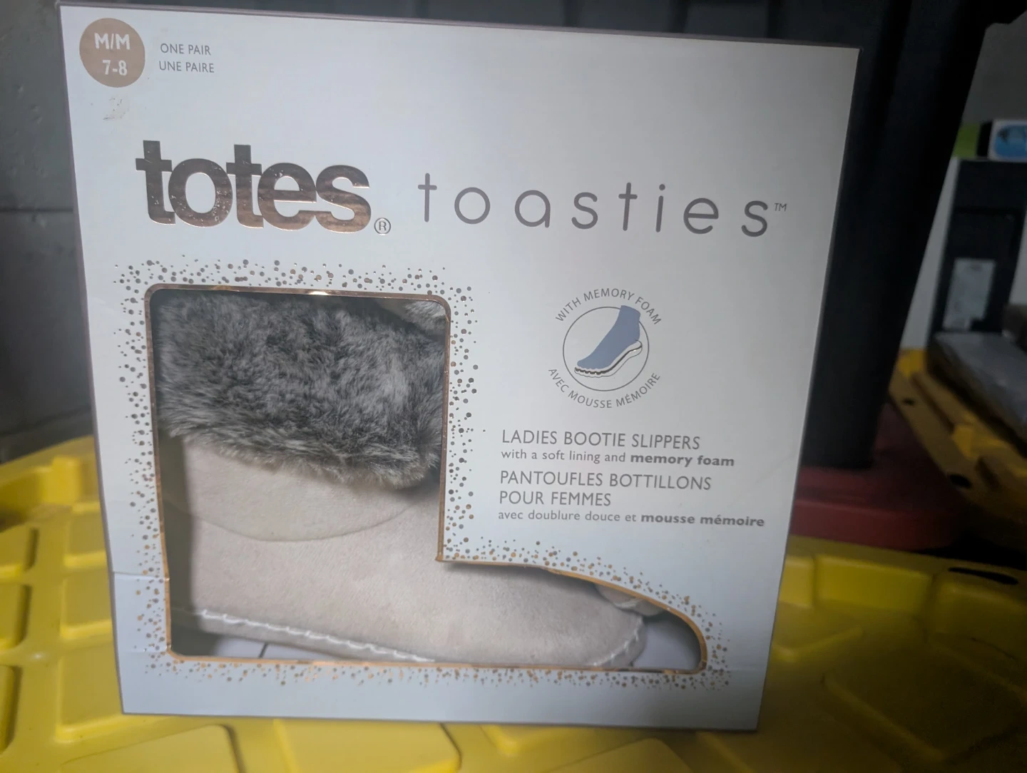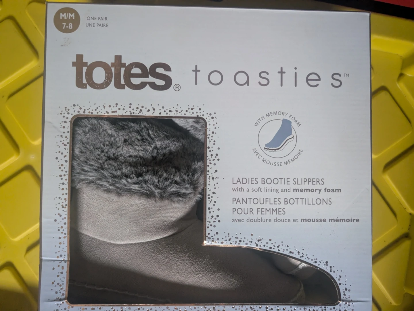 Selling a pair of Totes Toasties ladies bootie slippers, size M/M brand new and never warn which is equivalent to size 7-8. They have a soft lining and memory foam for extra comfort! These slippers are brand new and come in the original box