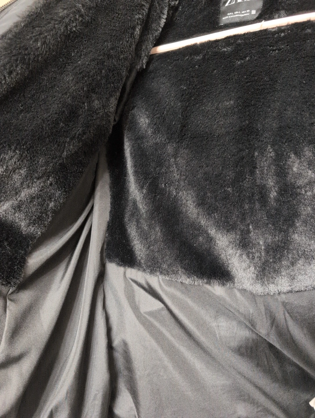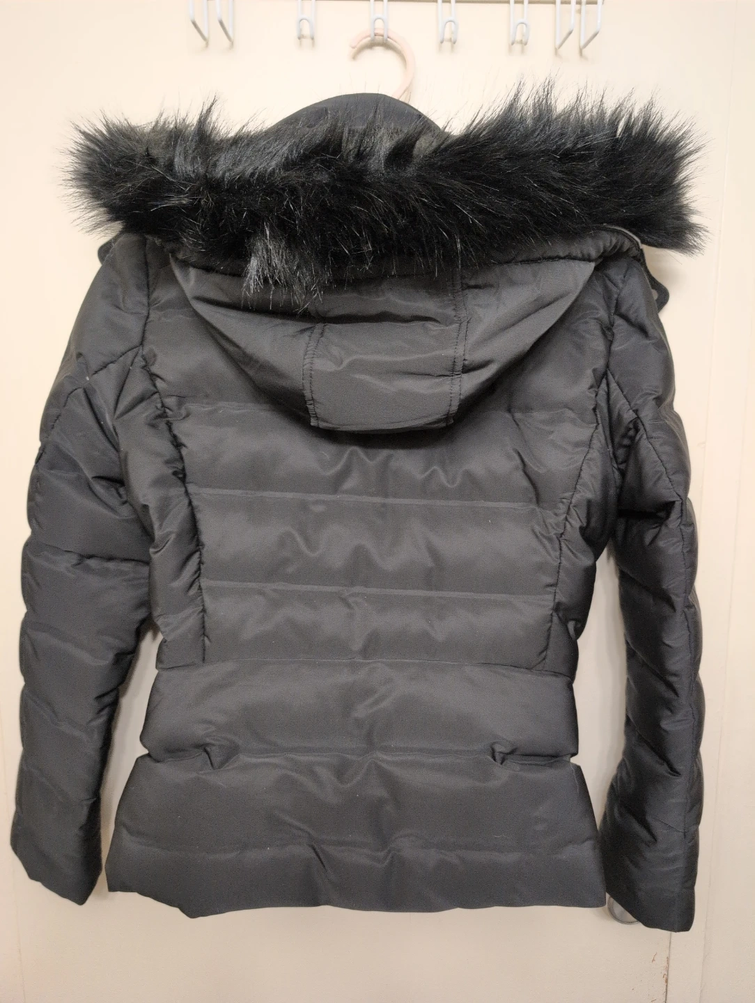 Selling a Zara black down jacket in size L. Fits more like S/M. It's in great condition and perfect for the colder weather. The jacket features a faux fur trim on the hood and a zip-up front. I have gained weight and it no longer fits me.The image looks lighter than the true black that it is.