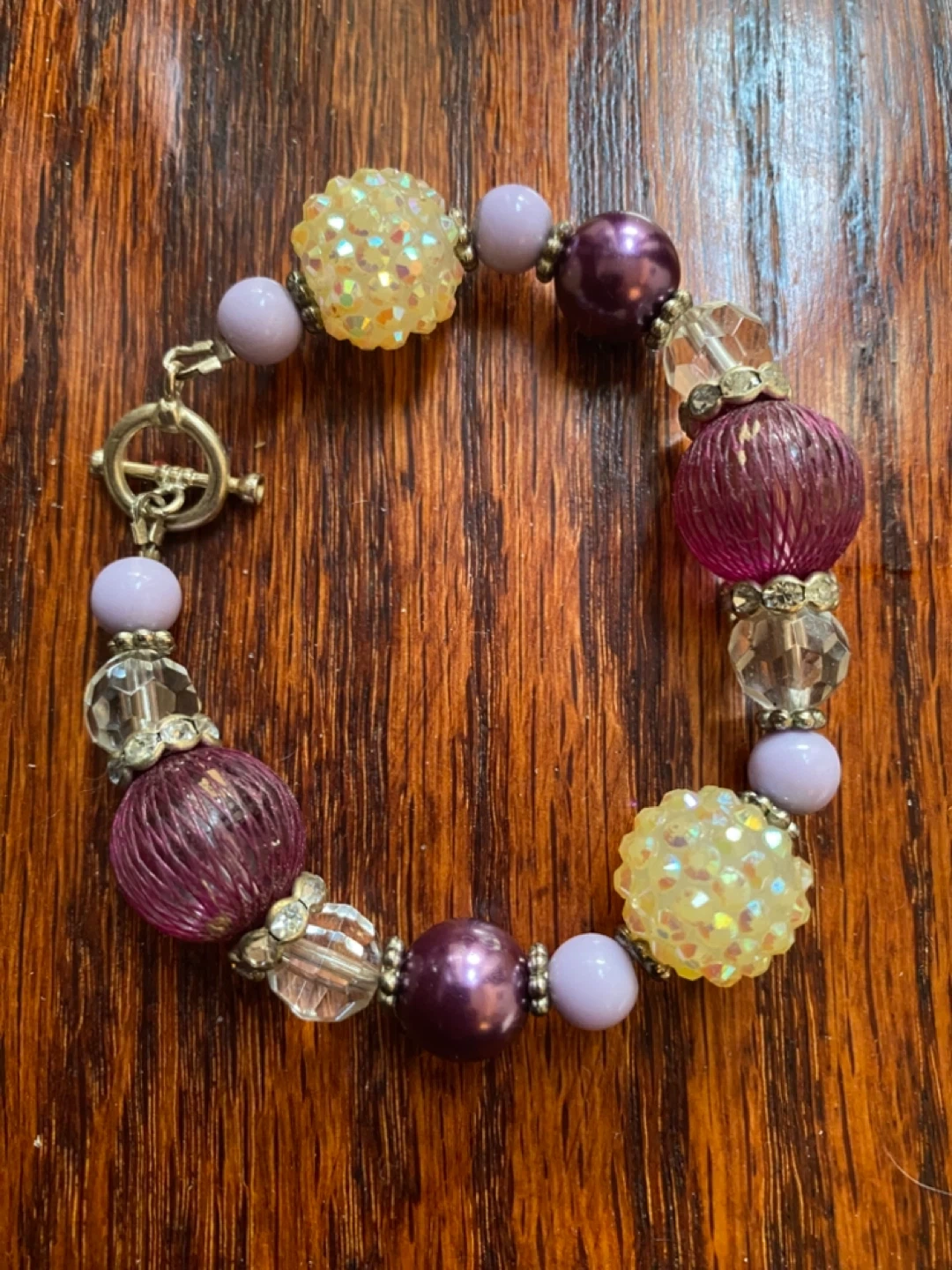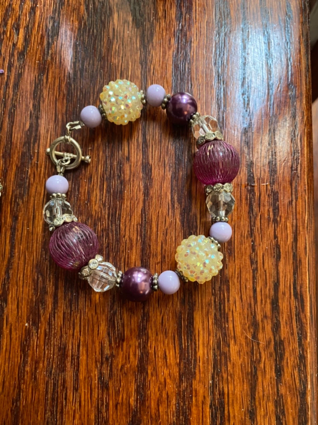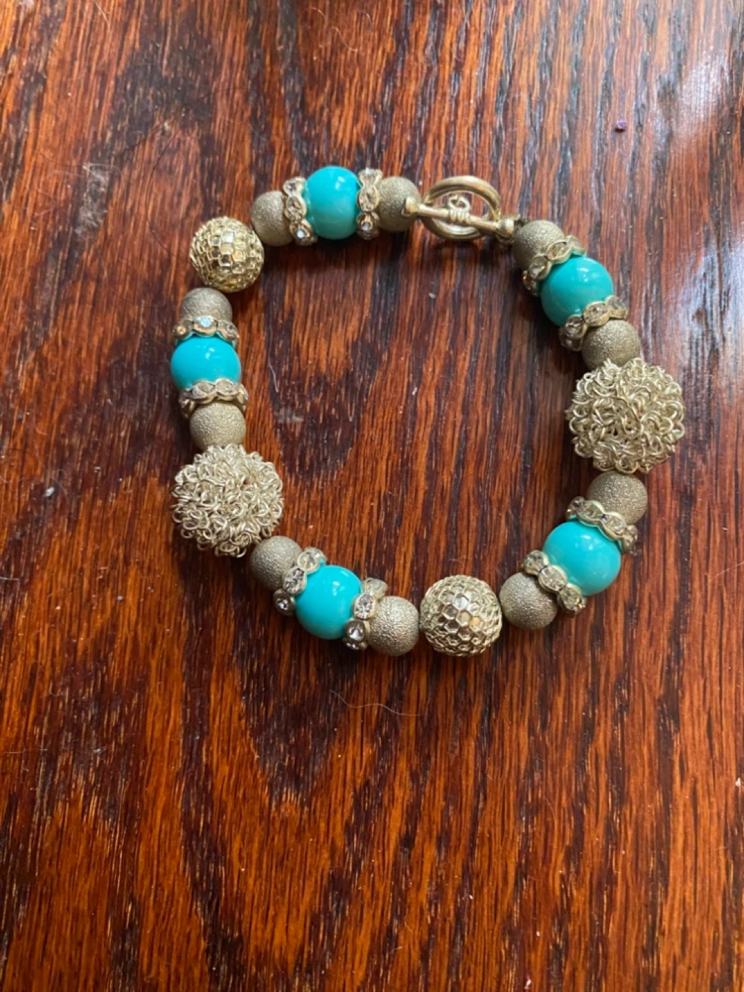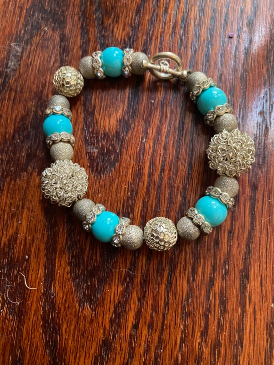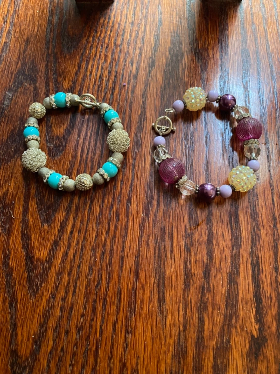 Selling two beaded bracelets. One is turquoise and gold, the other is purple and clear. Both are in great condition and have a unique look