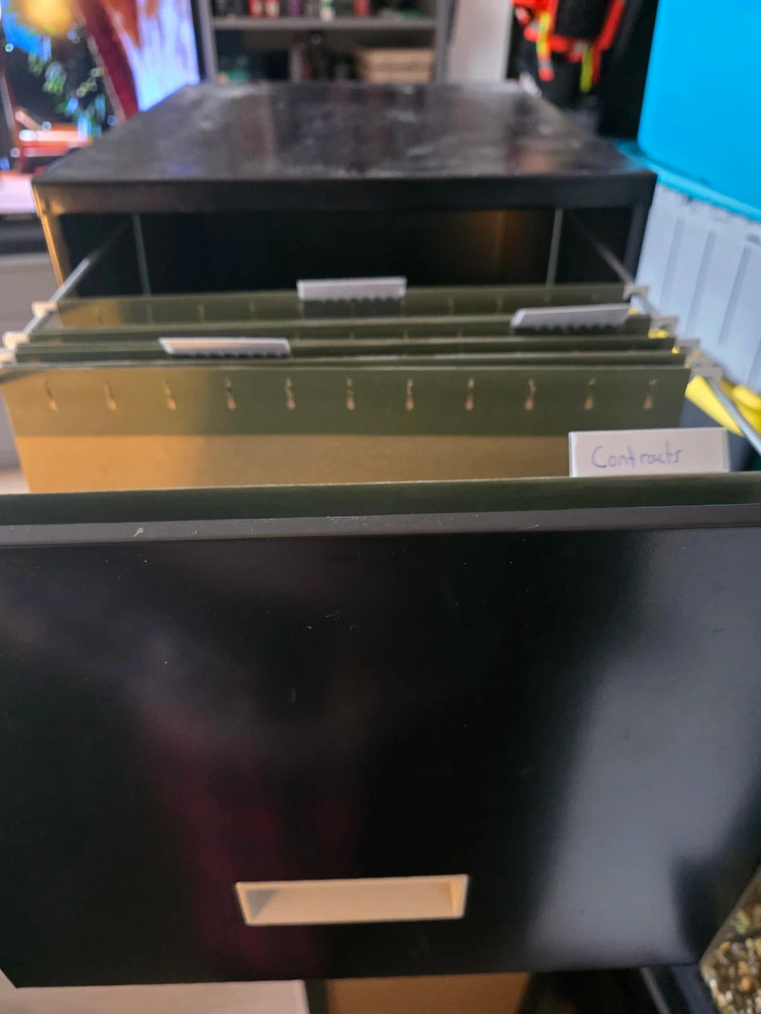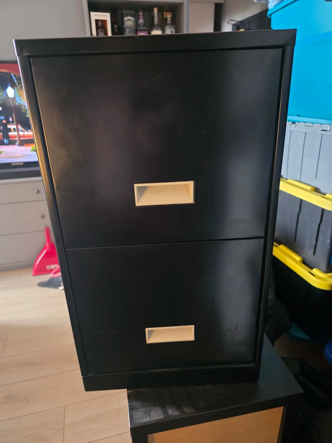 Selling a black two-drawer filing cabinet. It's in good condition and ready to help you organize your important documents! Great for home or office use