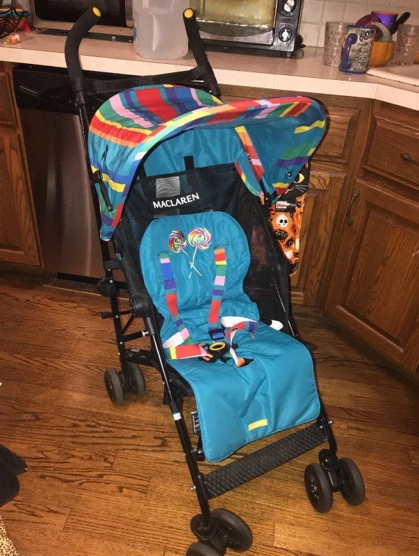 Selling a Maclaren stroller in great condition! It features a teal seat and a fun, colourful rainbow canopy. Perfect for little ones on the go! Also includes raincover and cupholder attachment. Practically new!