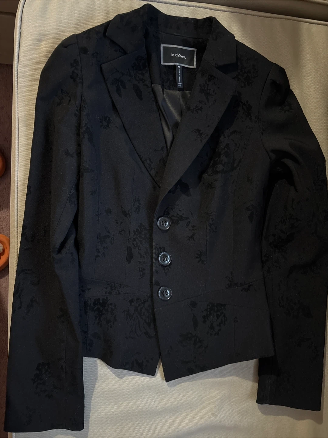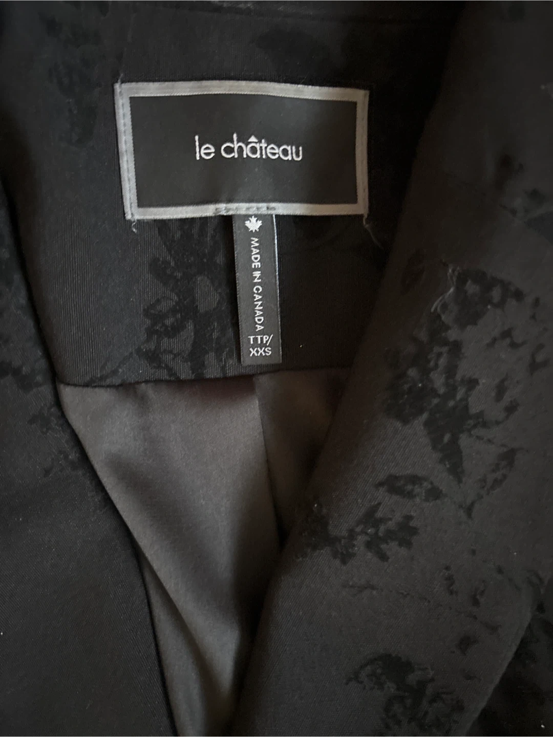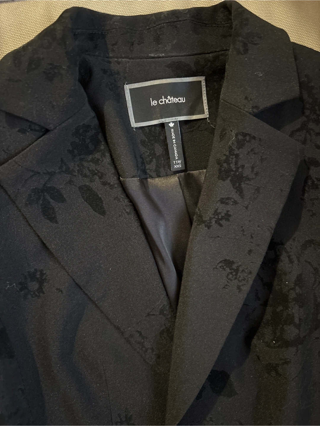 Selling a Le Chateau black blazer in size XXS. It's in great condition and features a subtle floral pattern. Made in Canada!