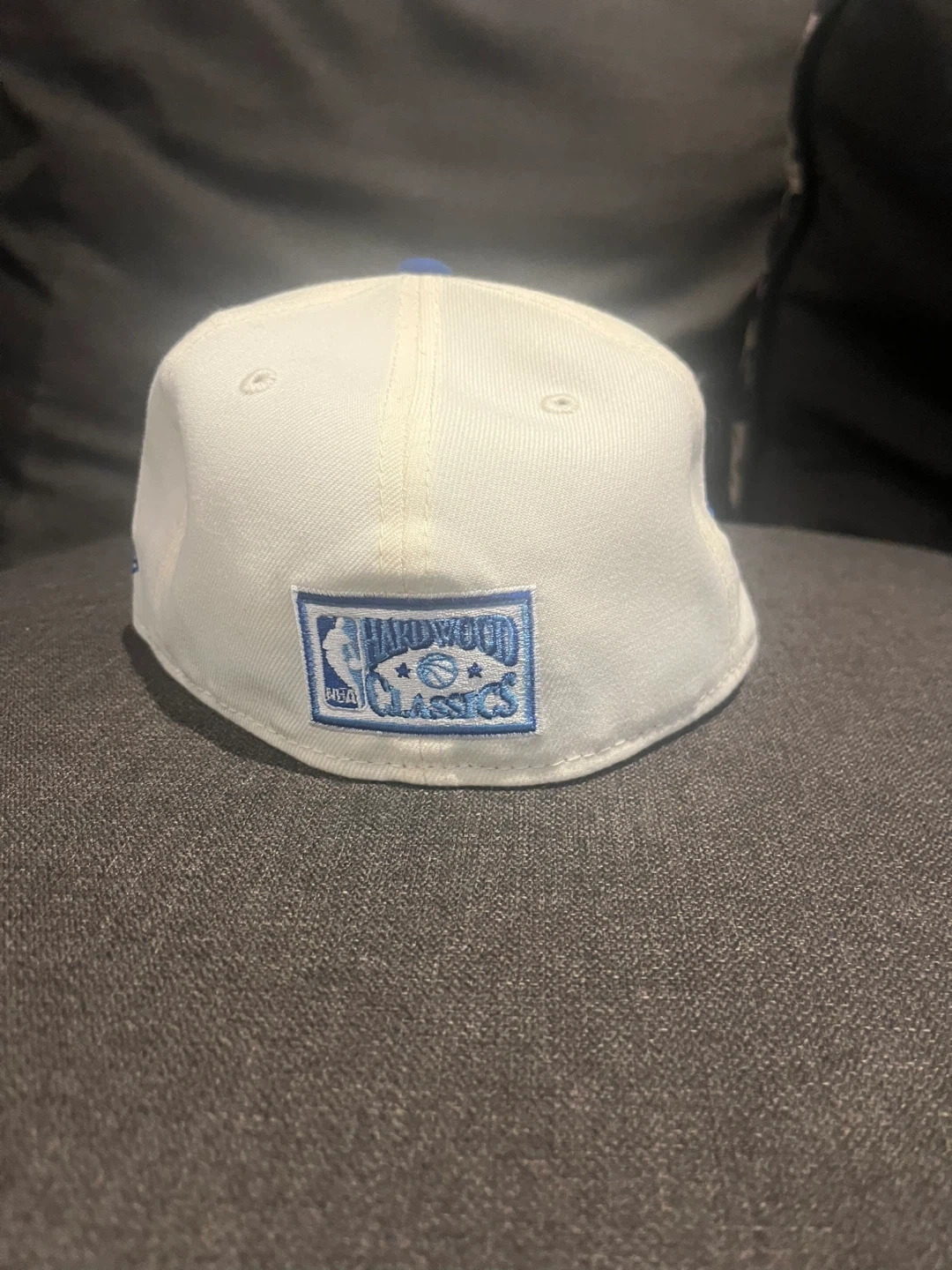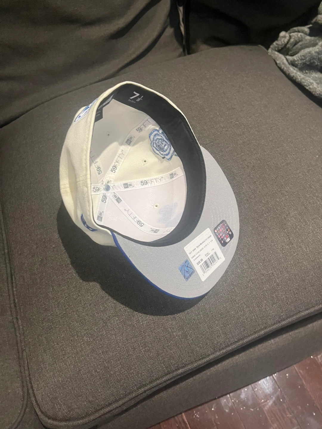 Selling a New Era Los Angeles Dodgers 59FIFTY fitted cap. It's a size 7 1/8 and features a blue brim with a cream coloured top. The hat has a 'Hardwood Classics' logo on the back and the original price tag shows it was $58.50. Never worn!