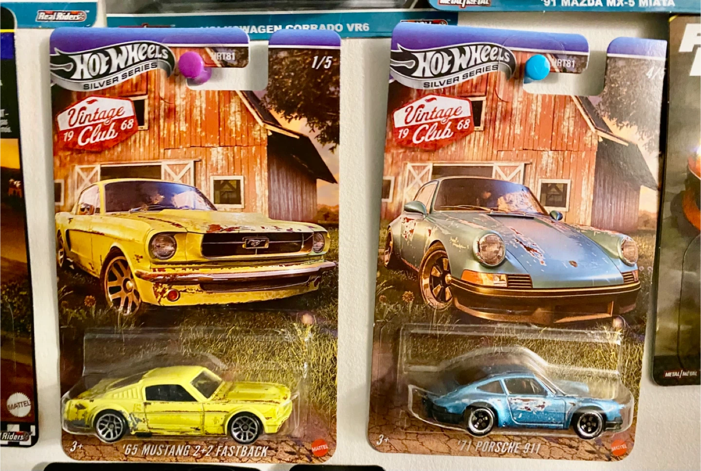 Two Hot Wheels Silver Series cars: a '65 Mustang 2+2 Fastback and a '71 Porsche 911! Both are part of the Vintage Club '68 collection. Great for collectors or anyone who loves classic cars. $7.00 each or 2 for $13.00