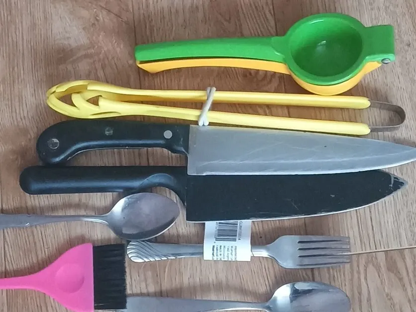 Selling a collection of assorted kitchen utensils. Includes a lemon/lime squeezer, tongs, knives, spoons, a fork, and a basting brush. Perfect for stocking up a new kitchen or replacing worn-out tools