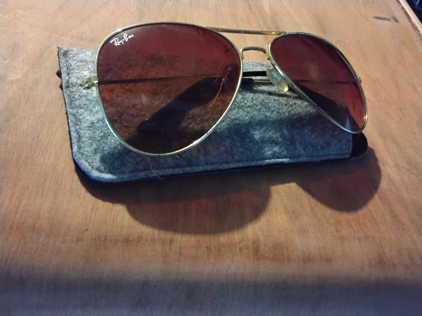 The sunglasses in the image are a pair of Ray-Ban Aviator style sunglasses with a gold-tone metal frame and brown or reddish-brown gradient lenses. This classic model is widely recognized and has been an iconic style since it was originally designed for U.S. aviators in 1937.