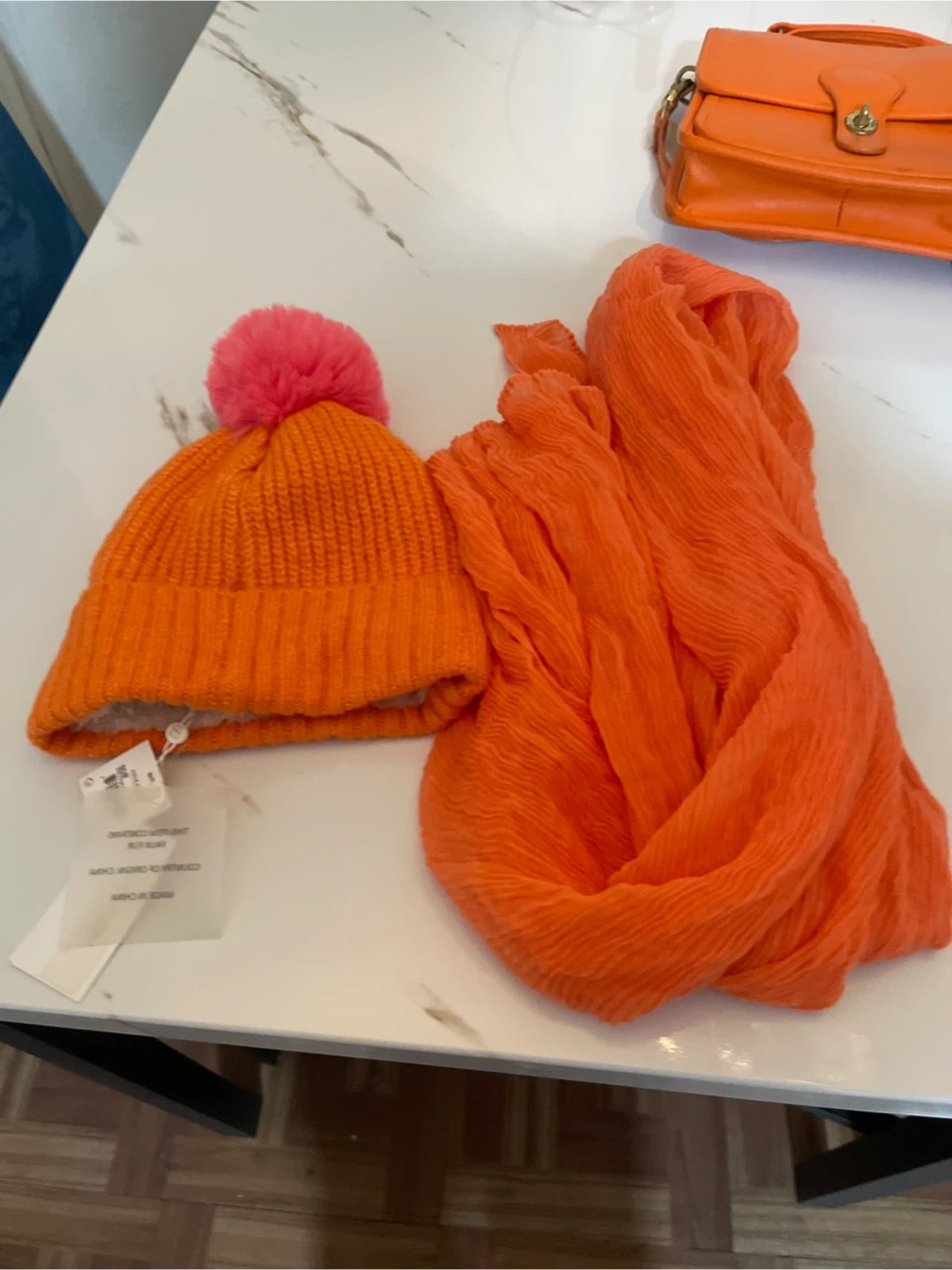 Here's a cozy orange hat with a pink pompom and a matching scarf! They're in great condition and ready to keep you warm.