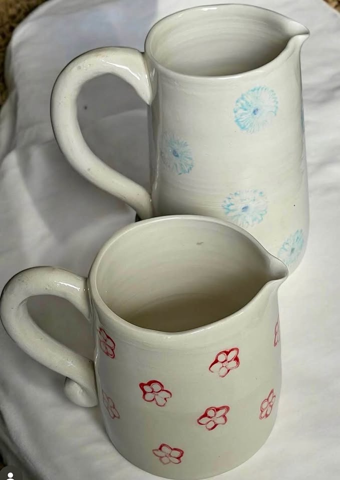 Two unique handmade ceramic pitchers for your kitchen or dining table! One is taller with blue flower decorations, and the other is shorter with red flower decorations. They're a great set together from my new pitcher collection. Ready to add a touch of charm to your home?
