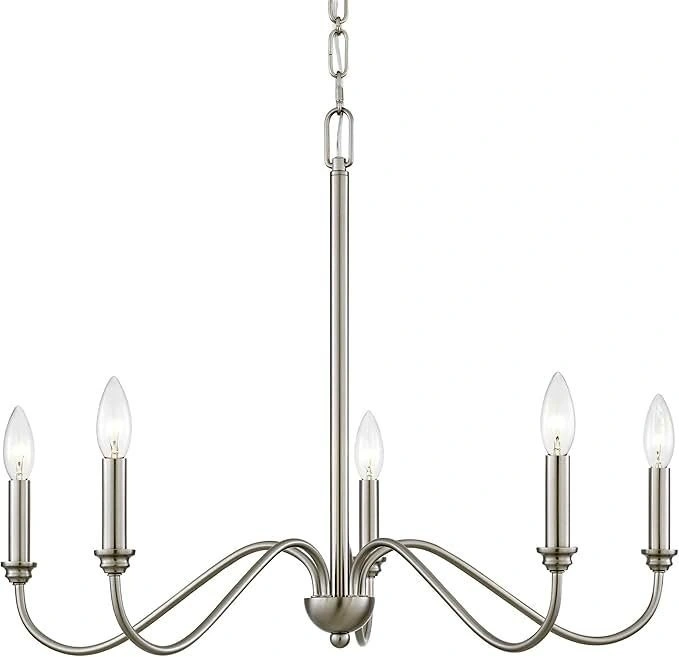 New in Box. This 5-light modern chandelier with rustic charm is an instant centerpiece, showcasing a classic brushed nickel finish to instantly upgrade your entryway or living room. The wide, large hanging light includes long curved arms with charming accented sockets, casting a warm glow over its installed space. This high quality rustic chandelier with stunning upward curved arms is very popular in luxury modern homes and event spaces. Its adjustable chain can easily accommodate rooms with high or sloped ceilings, easily transforming your space. UL listed for dry locations. Uses (5) LED, CFL or up to 60W Type B incandescent candelabra base bulbs. Bulbs sold separately. Pair with Edison Bulbs for a vintage look. Dimmer compatible. Includes all hardware for quick installation. Adjustable Height: 25" ~ 121", includes 8 feet of chain. Fixture Body: 21.25" (H) x 28" (D), Canopy: 5" (D)