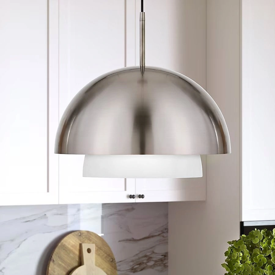 New in Box. Suspended from a hanging fixture, this pendant light is perfect for illuminating your entryway, dining room or kitchen island. Contemporary, modern design is amplified by a sleek metallic finish that extends into a bowl-shaped exterior shade. An interior white frosted glass shade add a layer of visual interest and focuses the light downward. Handcrafted in polished nickel finish, with an interior frosted white shade. It is paired with a dome-shaped shade. The shade is white frosted glass. Rated for one 60W incandescent bulb; 9W LED bulb, 13W fluorescent (CFL) bulb, or 9W self-ballasted LED bulb, E26-base bulb. Includes an adjustable, 8 ft polyester weave cord. Clean with a soft, dry cloth; no harsh chemicals or abrasive cleaning materials