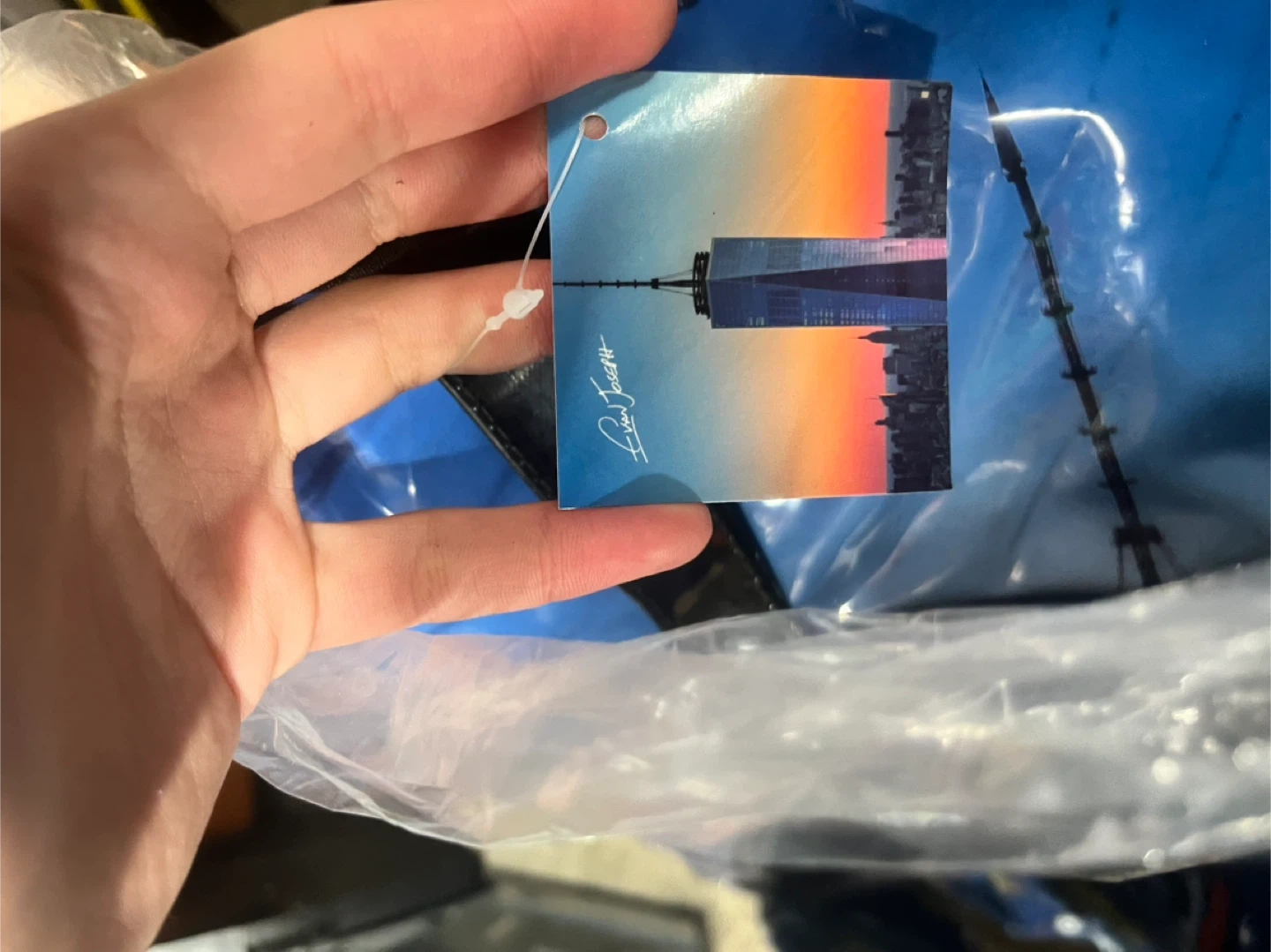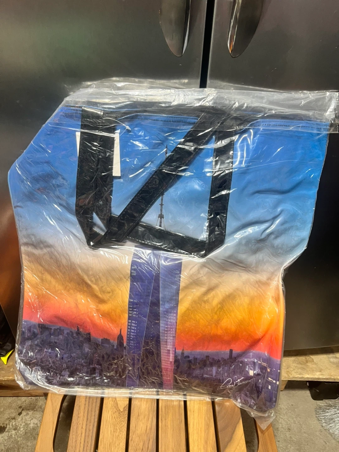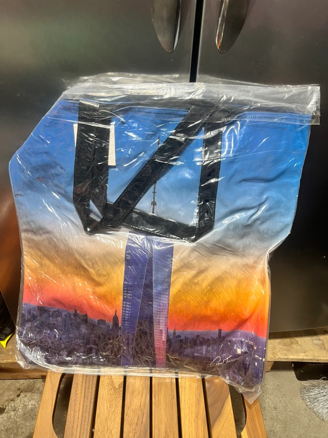 This is a tote bag featuring the New York City skyline. It's brand new and still in its original packaging. The bag has black handles and a colorful design showcasing the city's architecture.