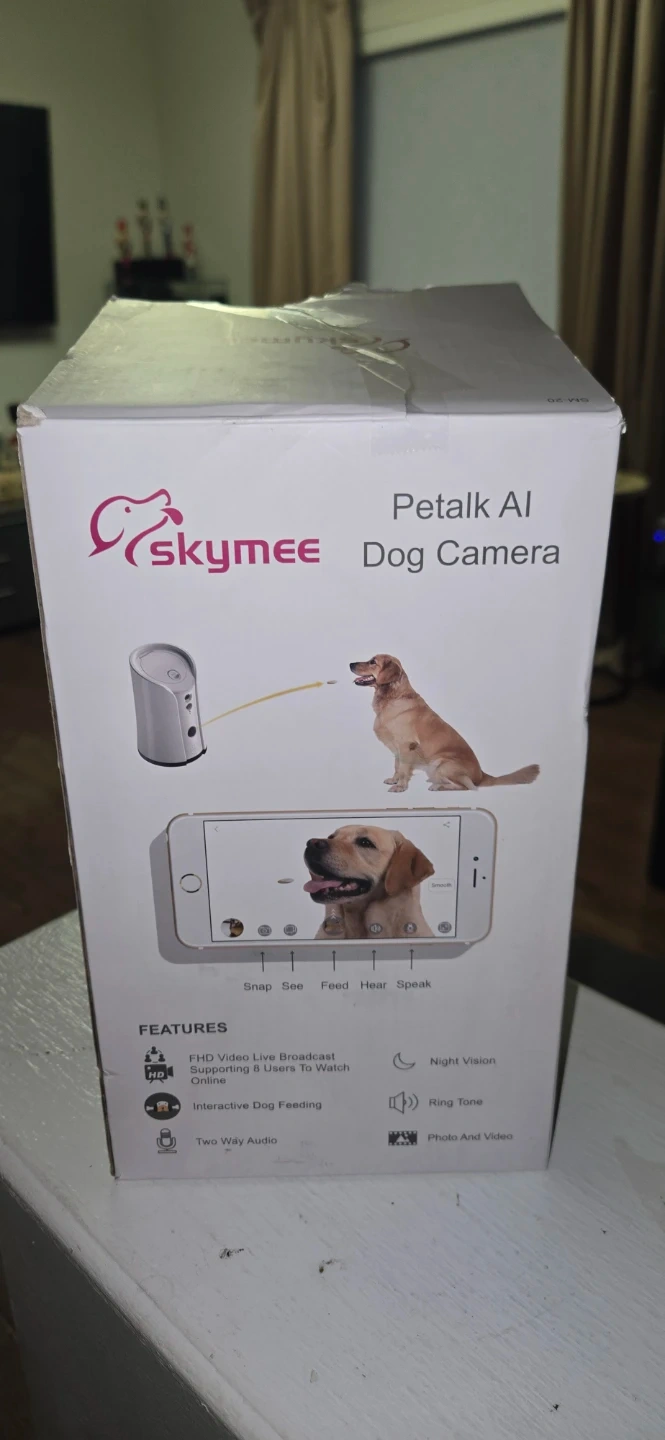 Selling a Skymee Petalk AI Dog Camera. It comes with the box, charger, and instructions. The camera features FHD video live broadcast, ability to watch online, interactive dog feeding, two-way audio, ring tone, and photo and video capabilities. It also has night vision!