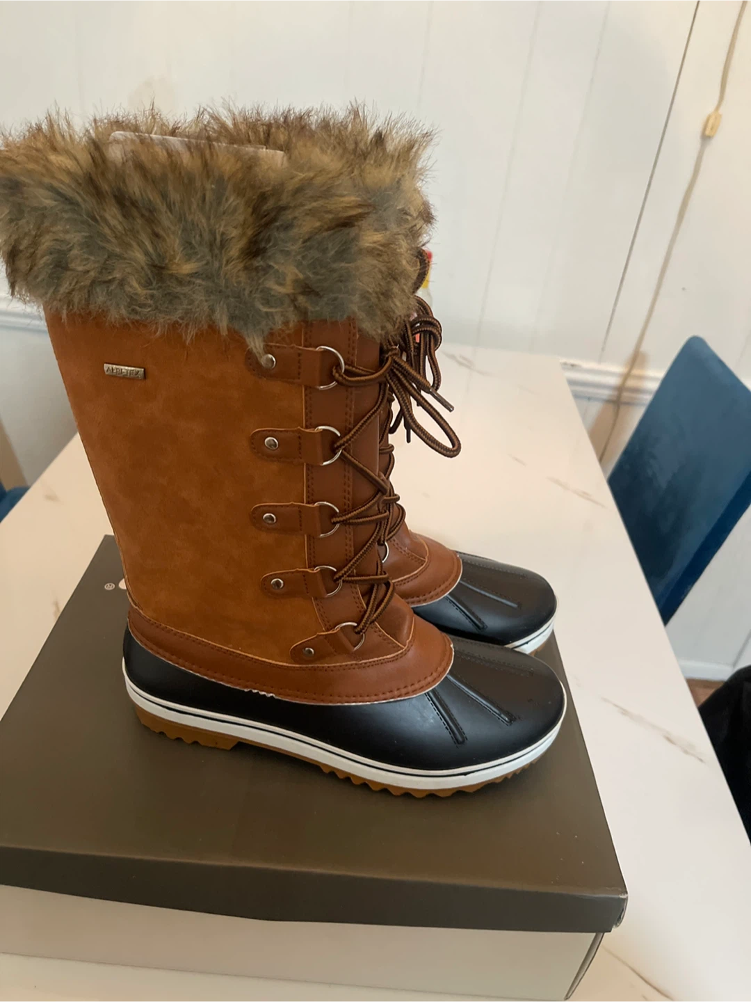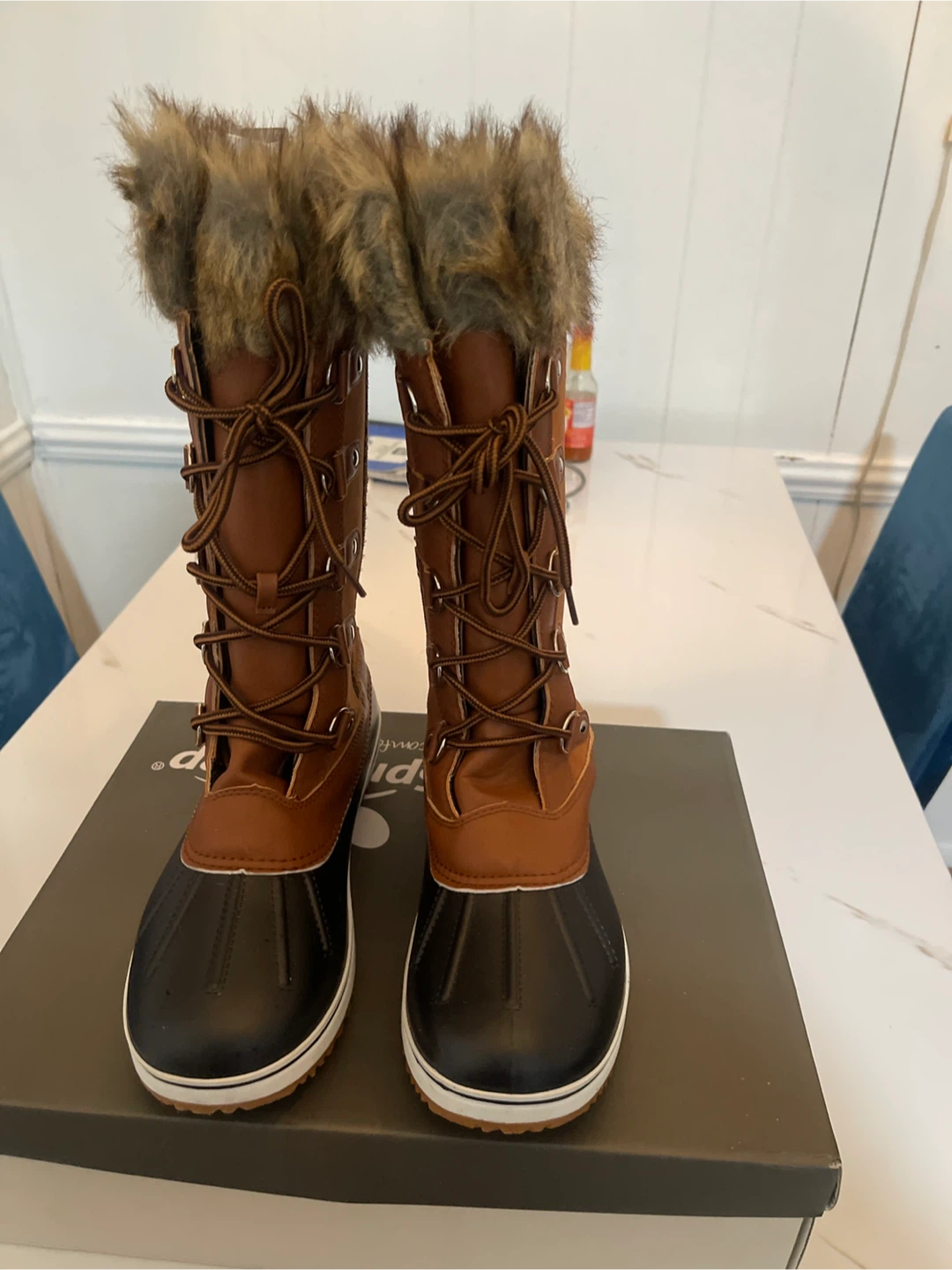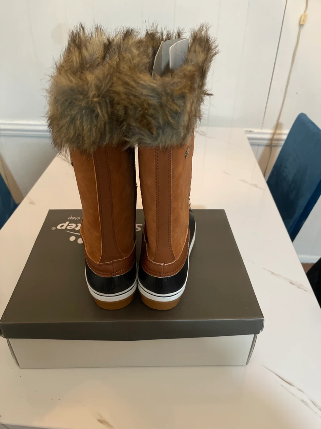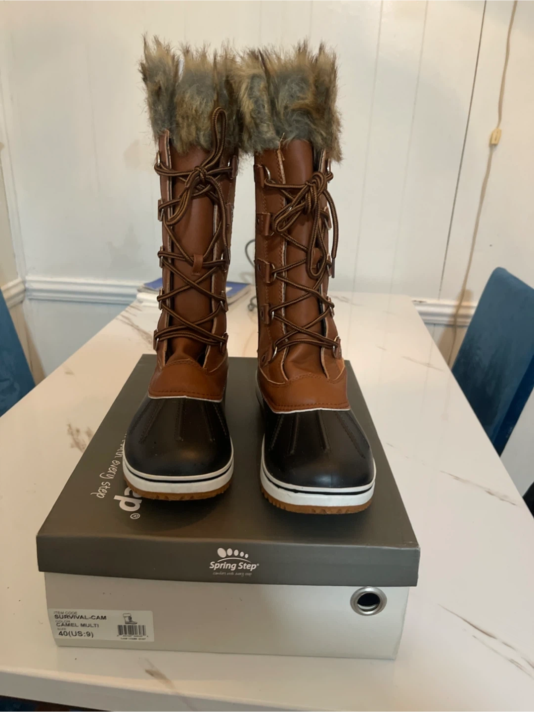 Get ready for winter with these stylish and warm Spring Step Survival-Cam winter boots! They come in a size 9 (US) and feature a beautiful brown color with faux fur trim. These boots are perfect for keeping your feet cozy and dry in snowy conditions. They come with the original box!