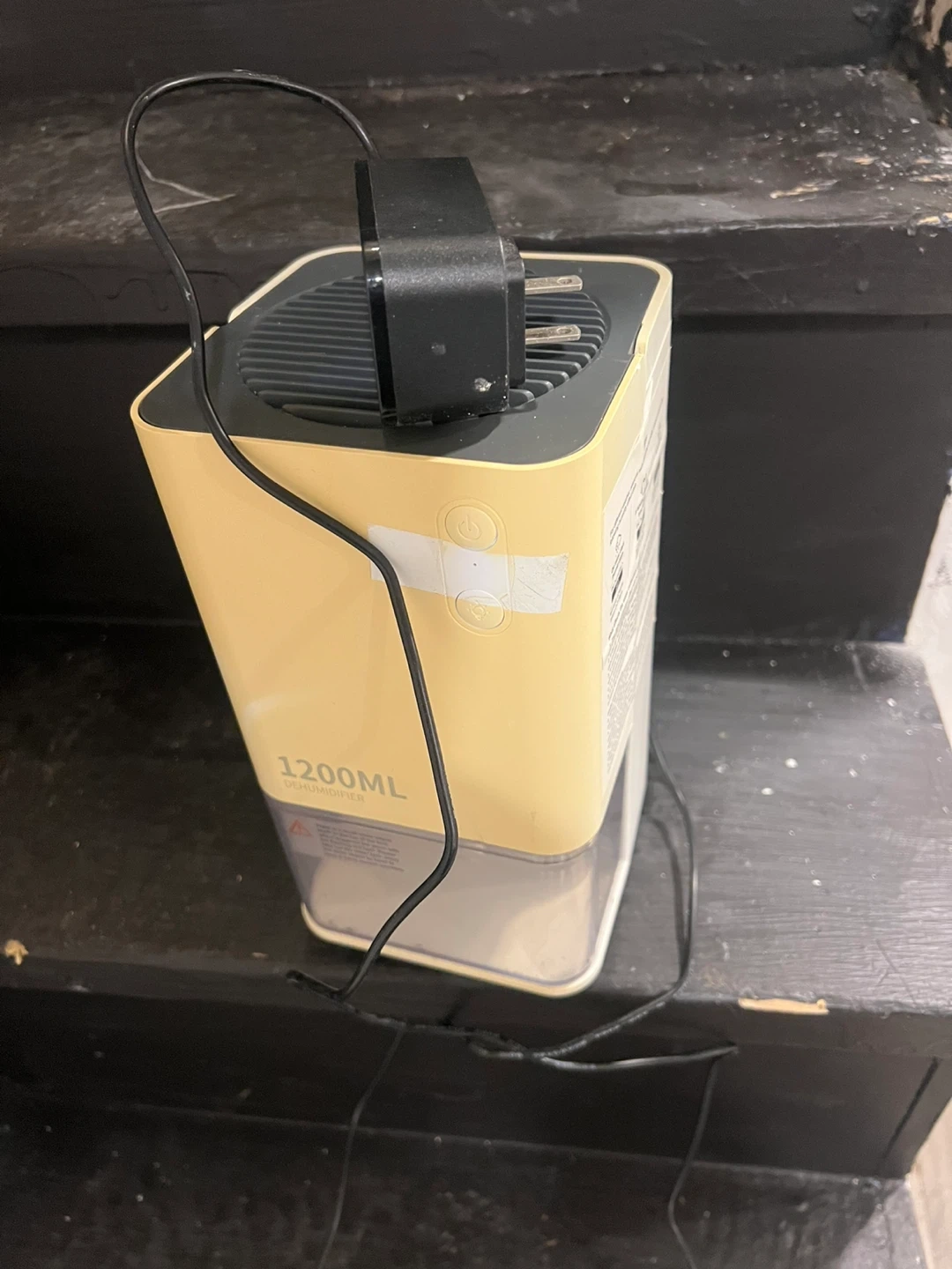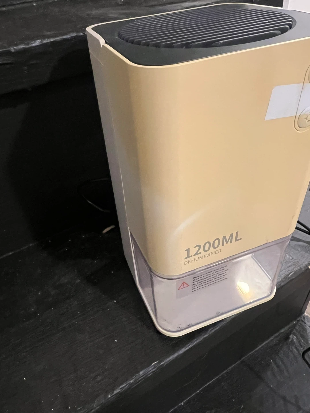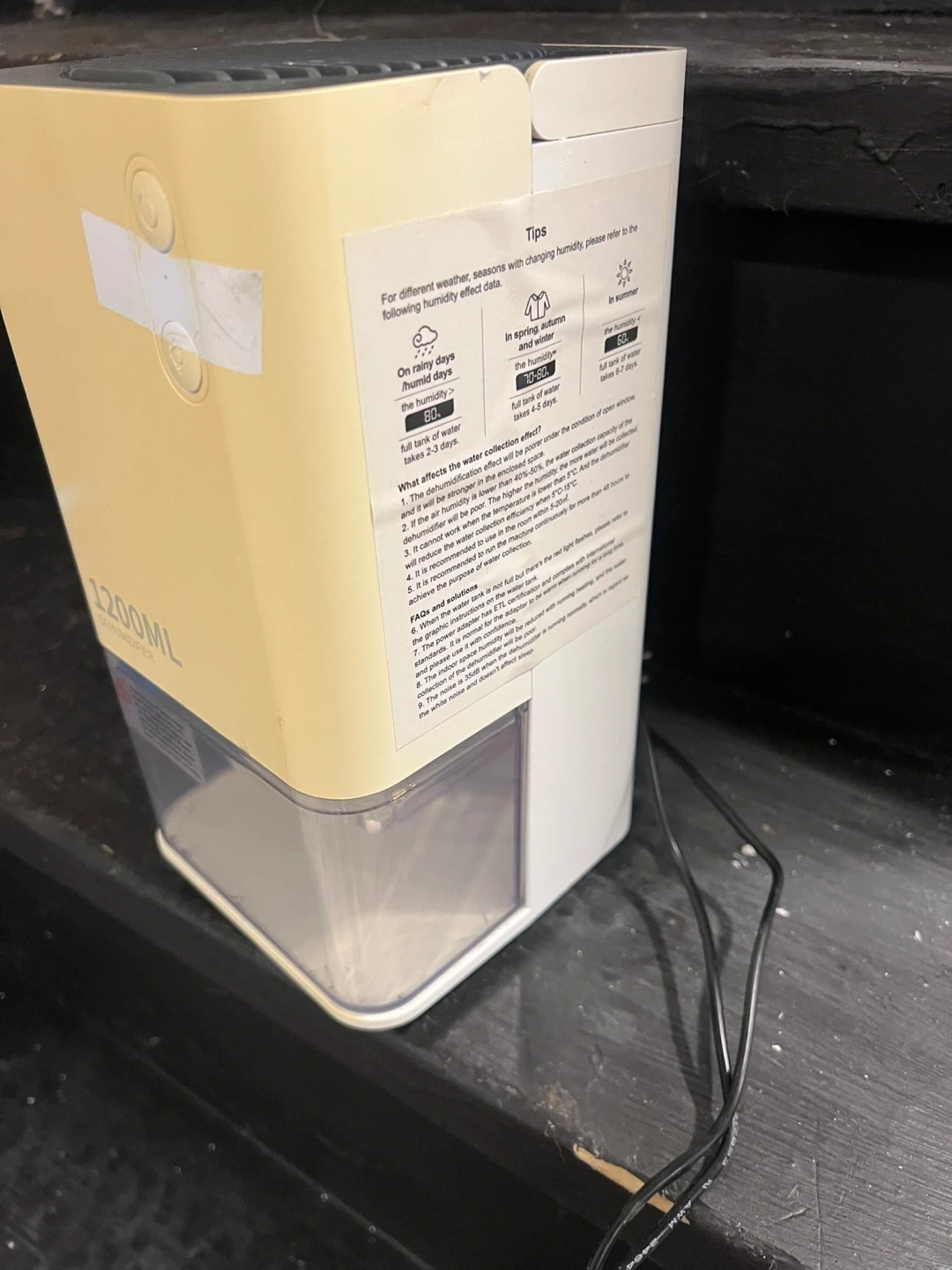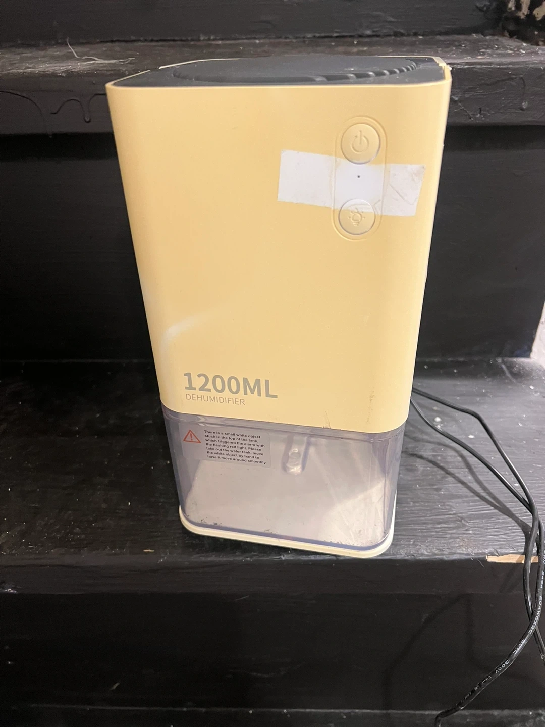 Selling a used 1200ML dehumidifier. It is a small, white object that collects water. It's perfect for different weather seasons with changing humidity effects