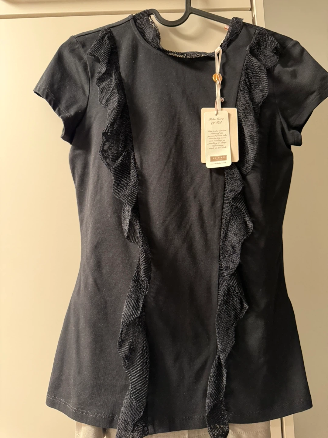 Selling a Ted Baker London black top. It's in great condition and features lovely ruffle detailing. The size is a Ted Baker size 1. Take a look if you're interested!