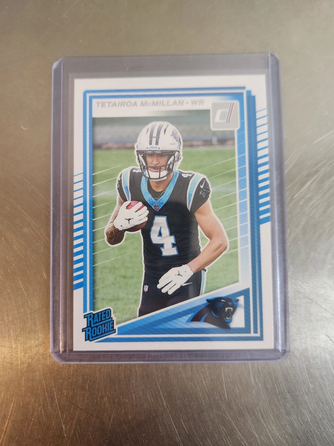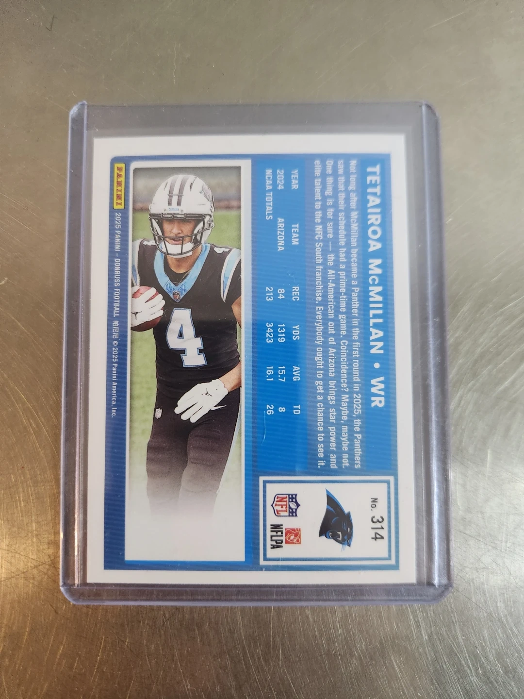 Selling a TETAIROA MCMILLAN WR football card. The card features the player in his Panthers uniform. It's number 314 in the series. The back of the card details his stats for the 2024 NCAA totals.