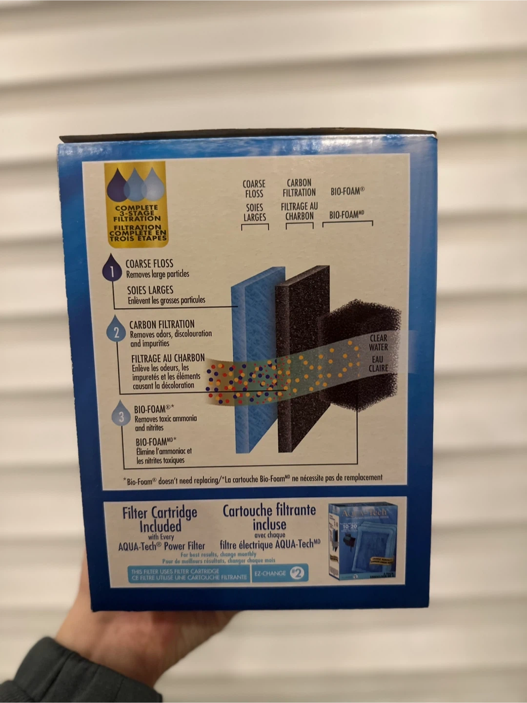 It features 3-stage filtration for healthier fish, including coarse floss, carbon filtration, and Bio-Foam.