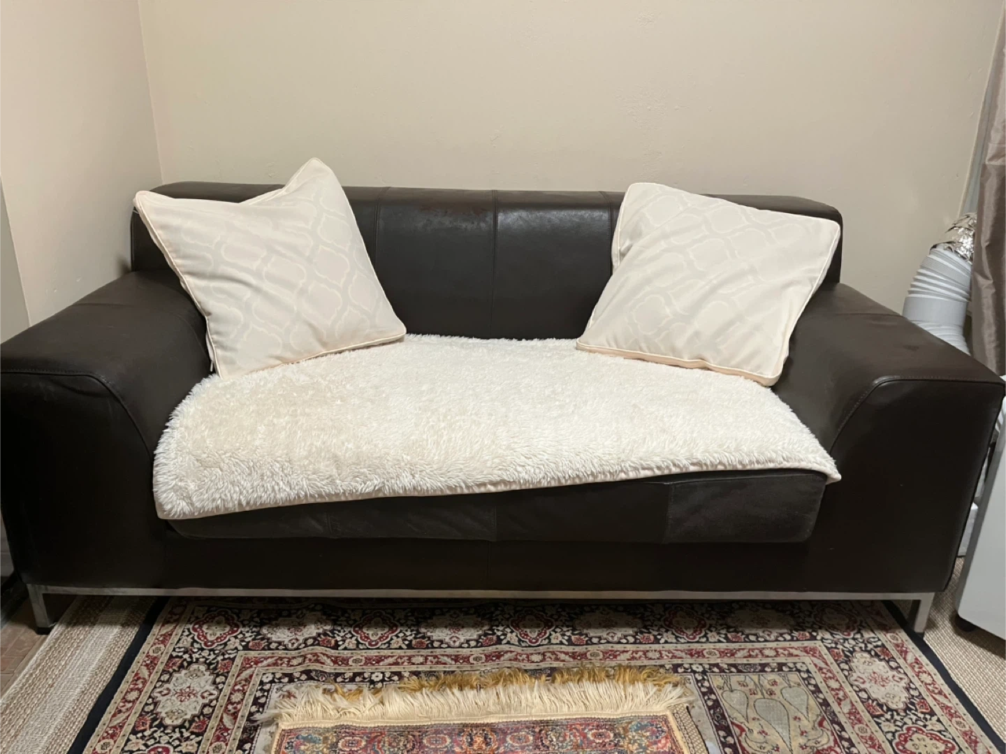 Selling a comfy brown leather sofa! It's in good condition and would be a great addition to any living room or den. It comes with two decorative pillows and a fluffy white throw blanket. Serious inquiries only