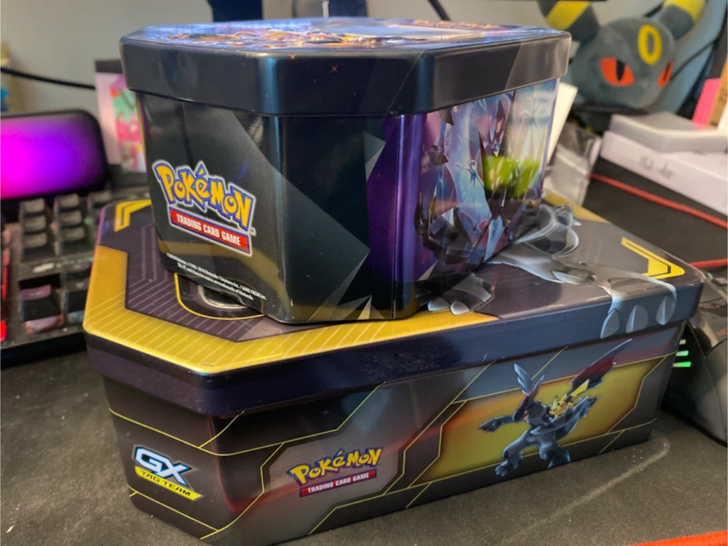 Selling two Pokémon Trading Card Game tins. Great for storing your cards or other small items! One is a GX Tag Team tin, and the other features a Solgaleo and Lunala design