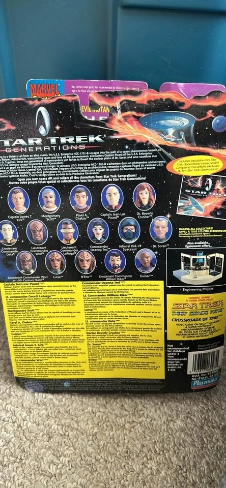 This is a Playmates 1994 Star Trek: Generations Guinan action figure. The figure is from the 1994 movie Star Trek Generations. It comes with accessories including a tray, glasses, a Starfleet monitor, and an exclusive mini movie poster.
