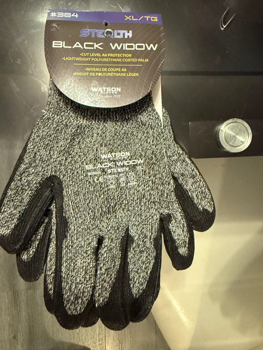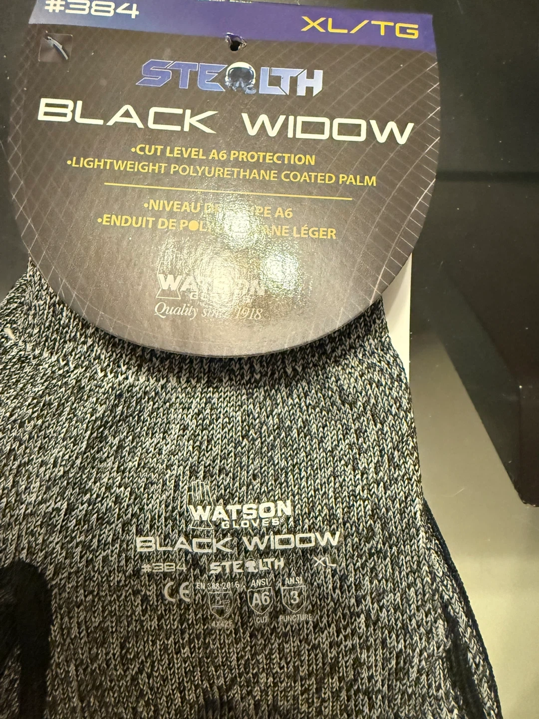 Selling a pair of Watson Gloves Stealth Black Widow gloves in size XL. These gloves feature cut level A6 protection and a lightweight polyurethane coated palm. Perfect for various tasks requiring hand protection!