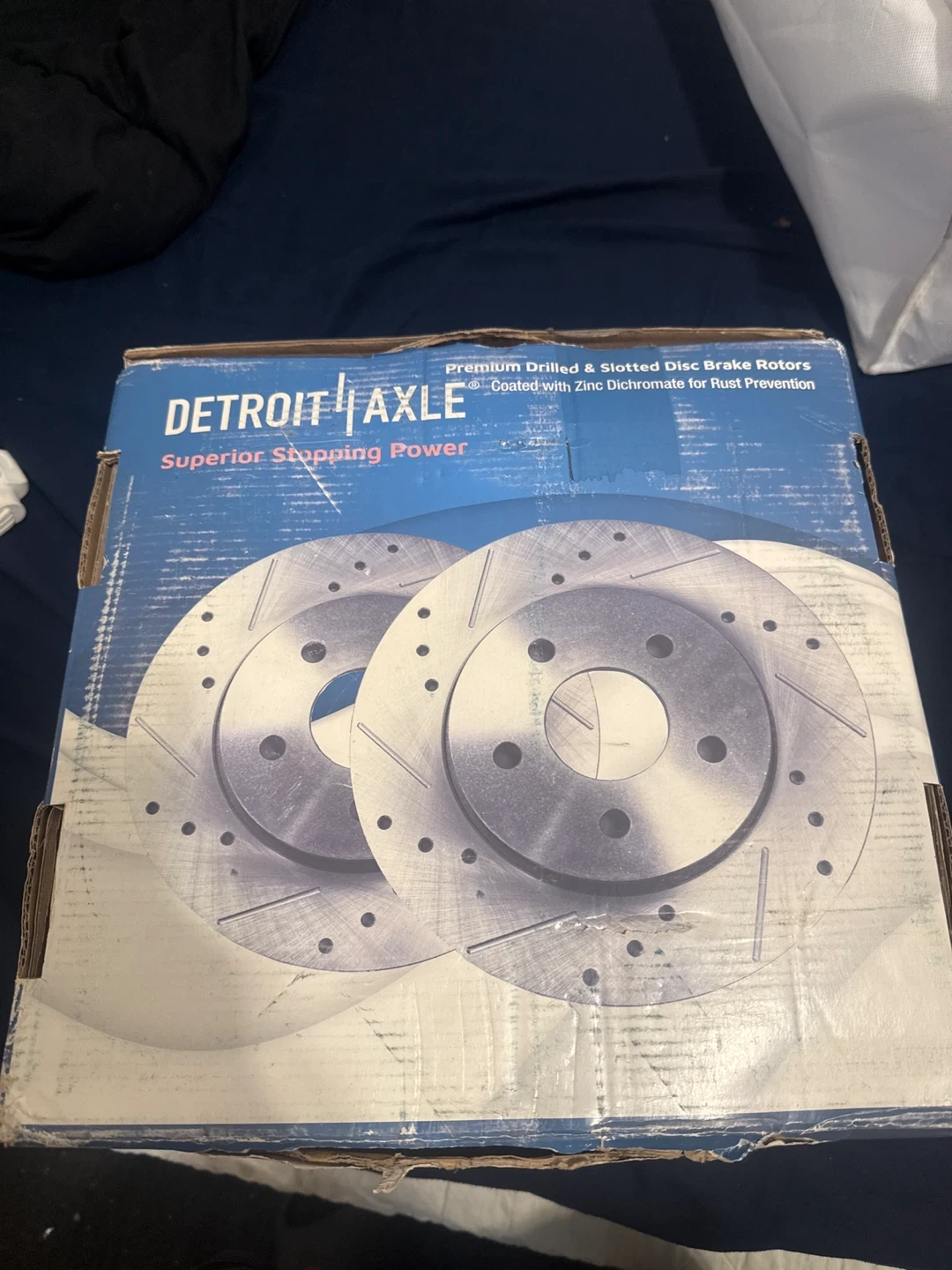 Selling a set of Detroit Axle premium drilled & slotted disc brake rotors. They are coated with zinc dichromate for rust prevention and provide superior stopping power. The box is included!