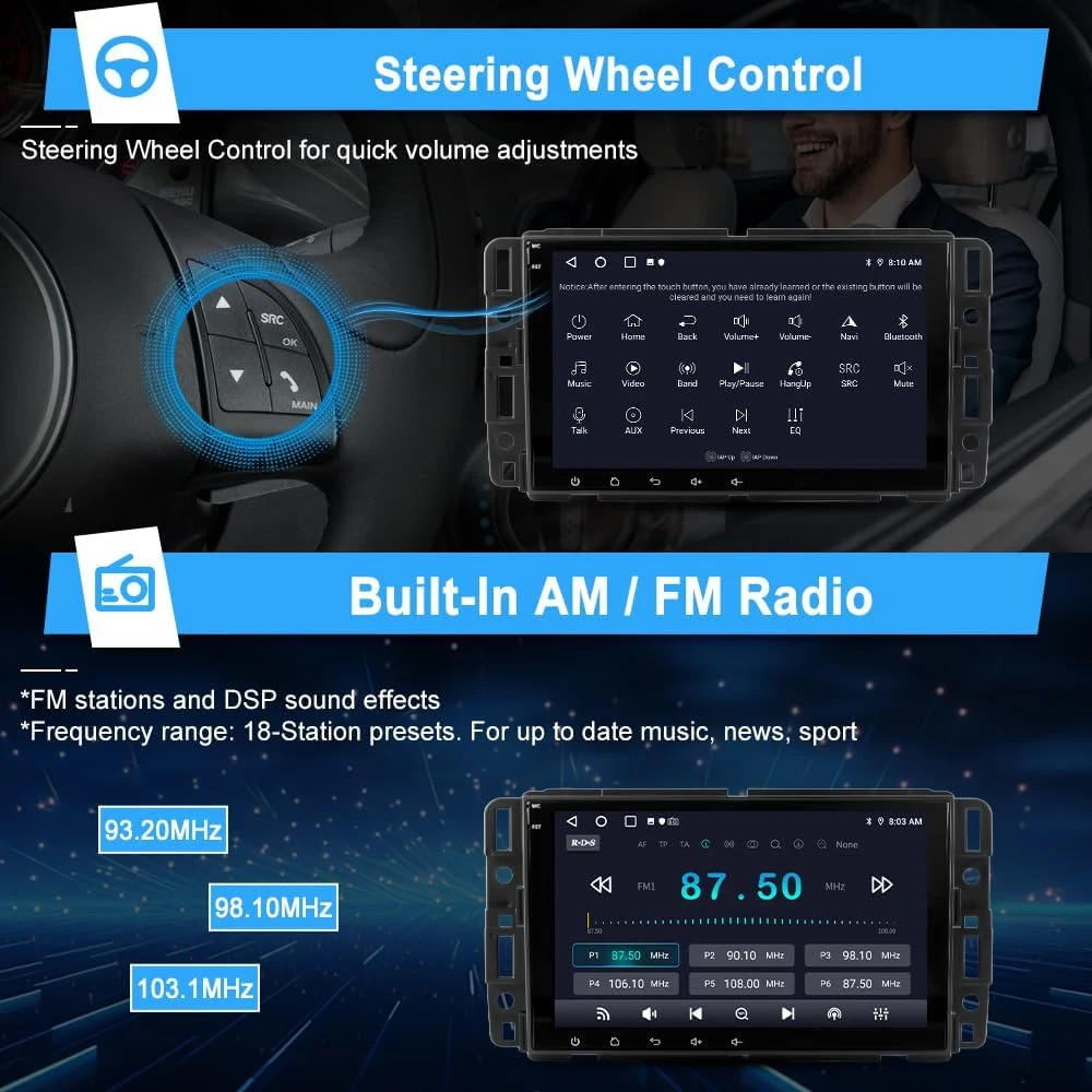 【Bluetooth & FM Radio】For GMC Sierra Yukon Radio with Bluetooth, support phonebook synchronization, hands-free call and mobile music streaming. The built-in microphone picks up your voice and your car speakers let you hear the person on the other side. With FM radio, you can transmit the radio to the car stereo via FM to enjoy the original car stereo, you can listen to real-time traffic, news broadcasts, weather forecasts etc.